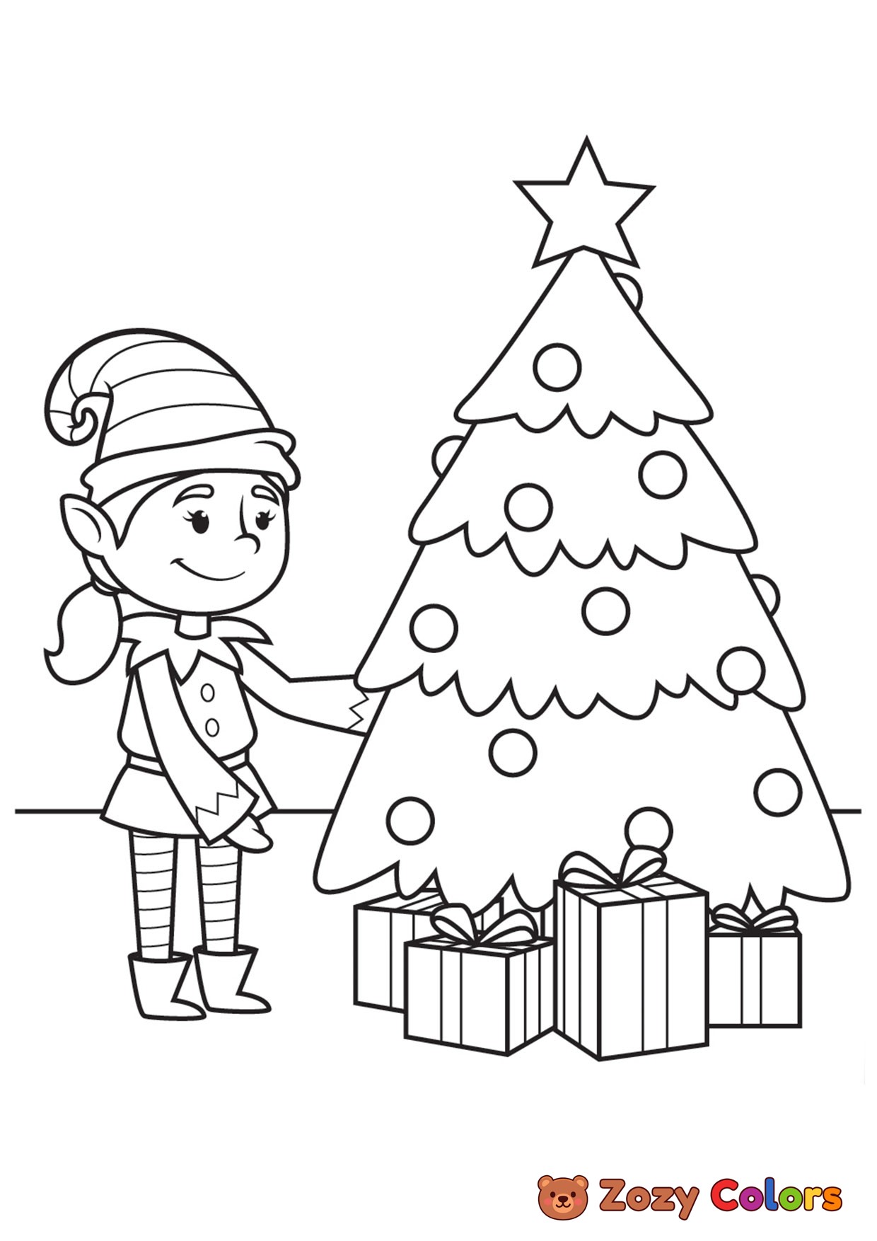 Christmas elf with presents. Coloring page to print or download and color for your kids.