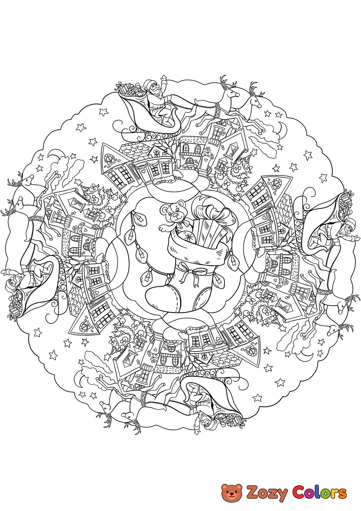 Christmas mandala with christmas stocking. Coloring page to print or download and color for your kids.