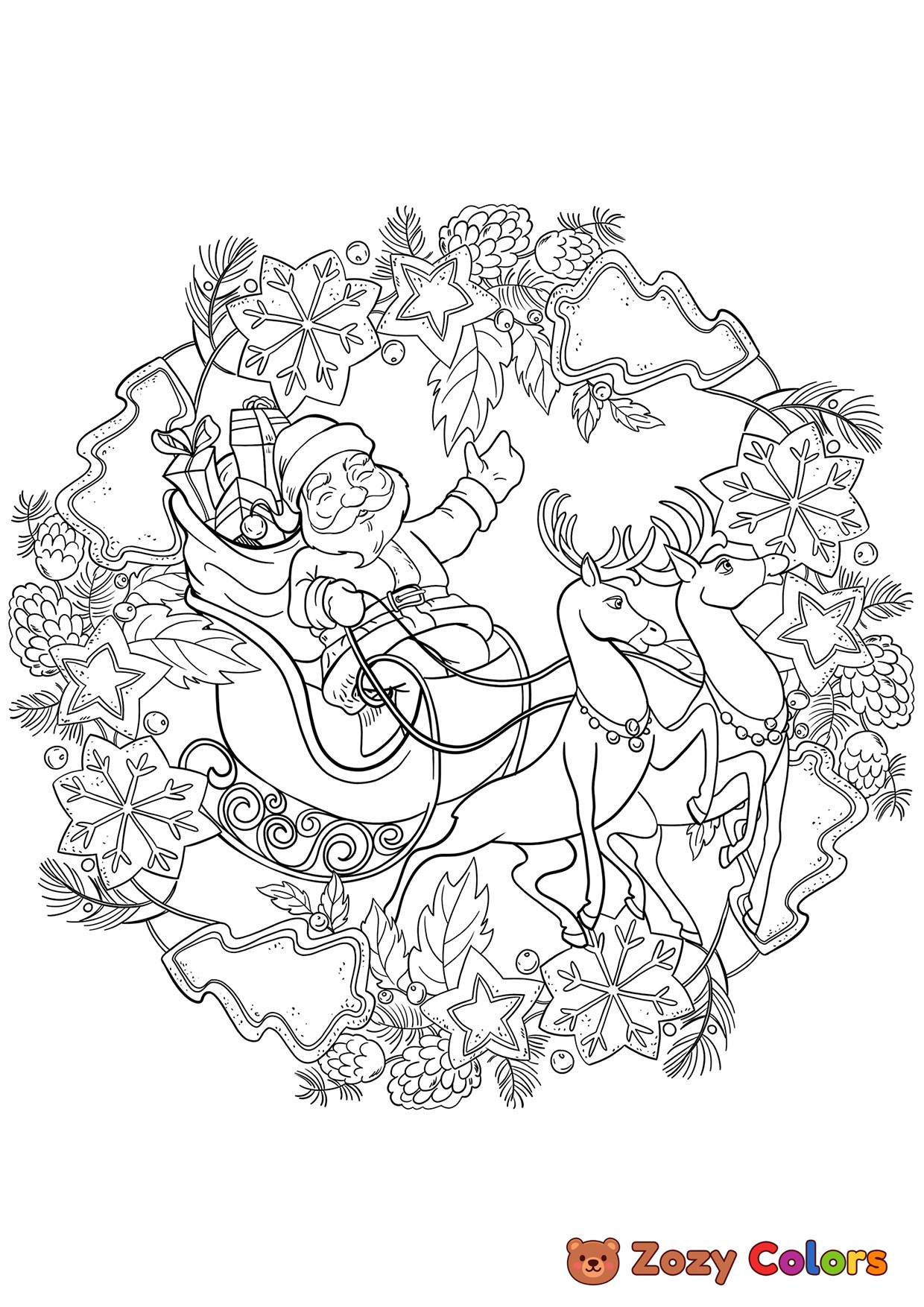Christmas mandala with Santas sled. Coloring page to print or download and color for your kids.