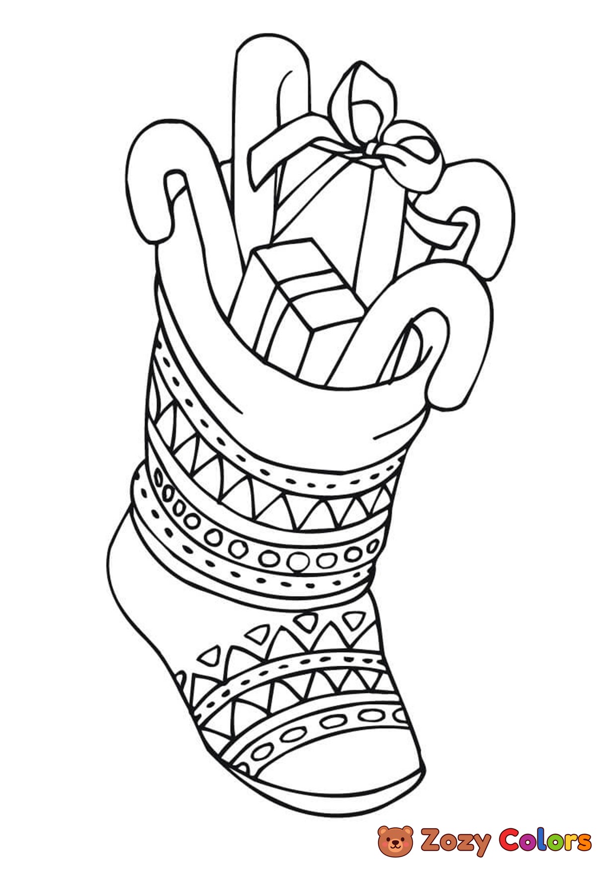 Christmas stocking with presents. Coloring page to print or download and color for your kids.