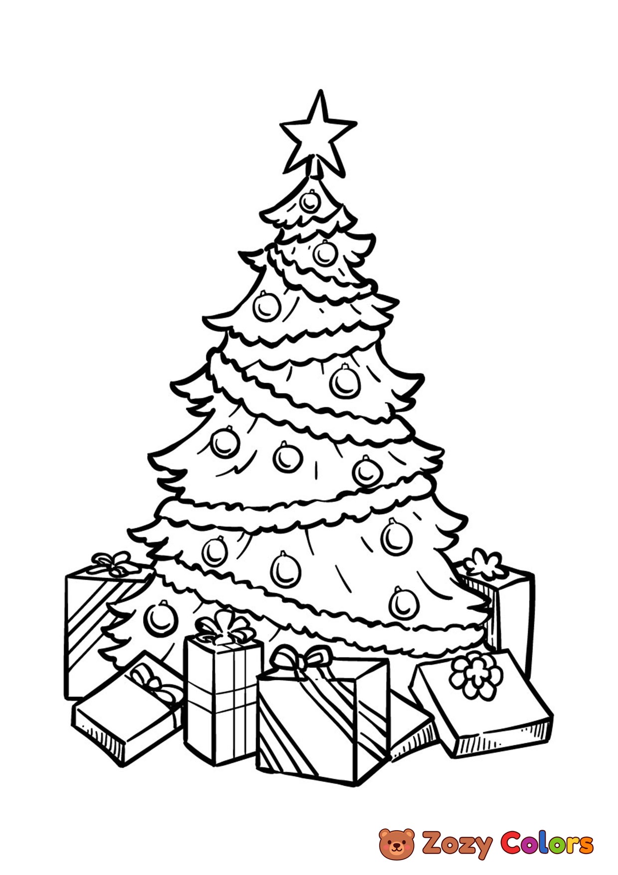 Christmas tree full of presents. Coloring page to print or download and color for your kids.
