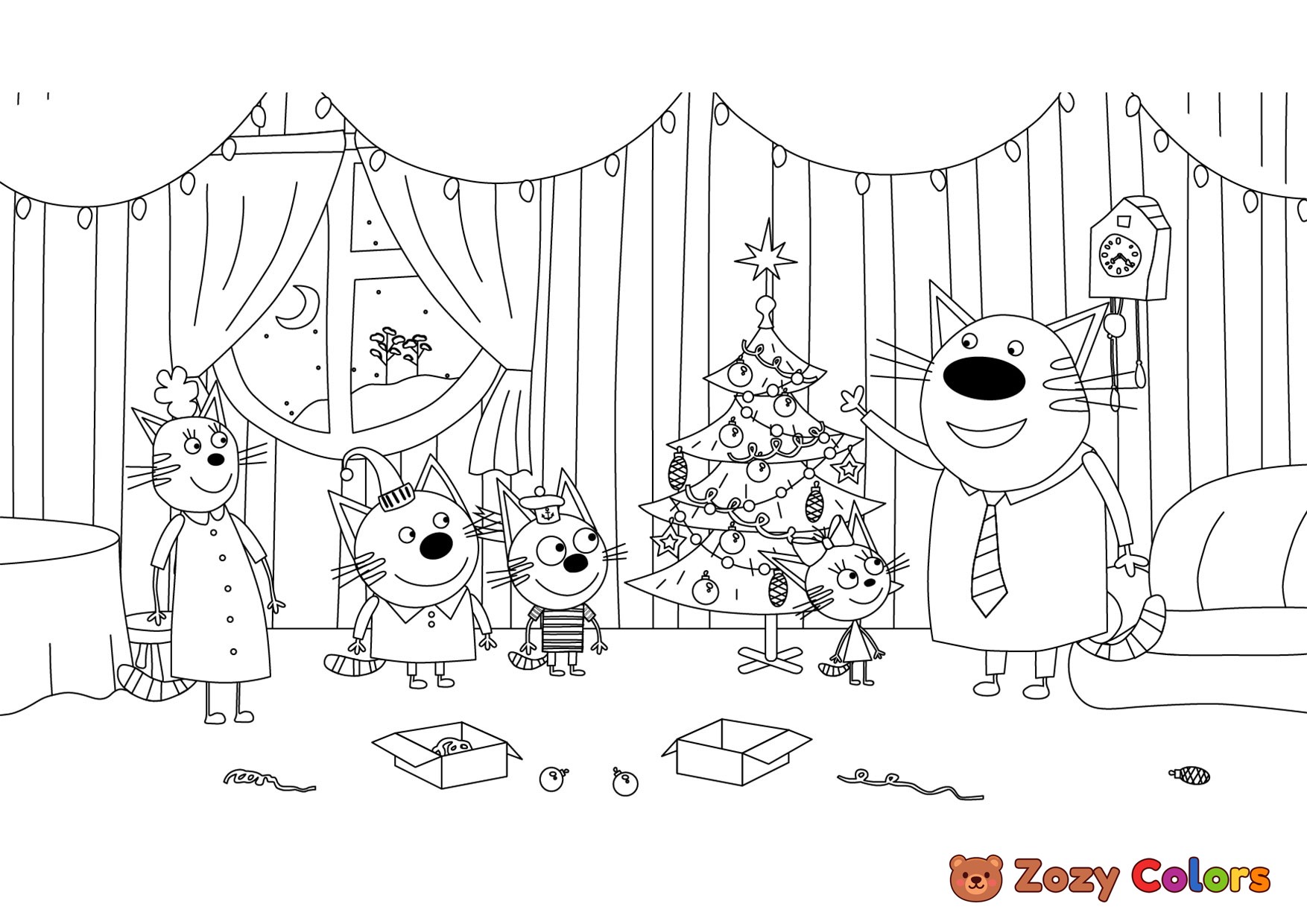 Christmas with Kid E Cats. Coloring page to print or download and color for your kids.