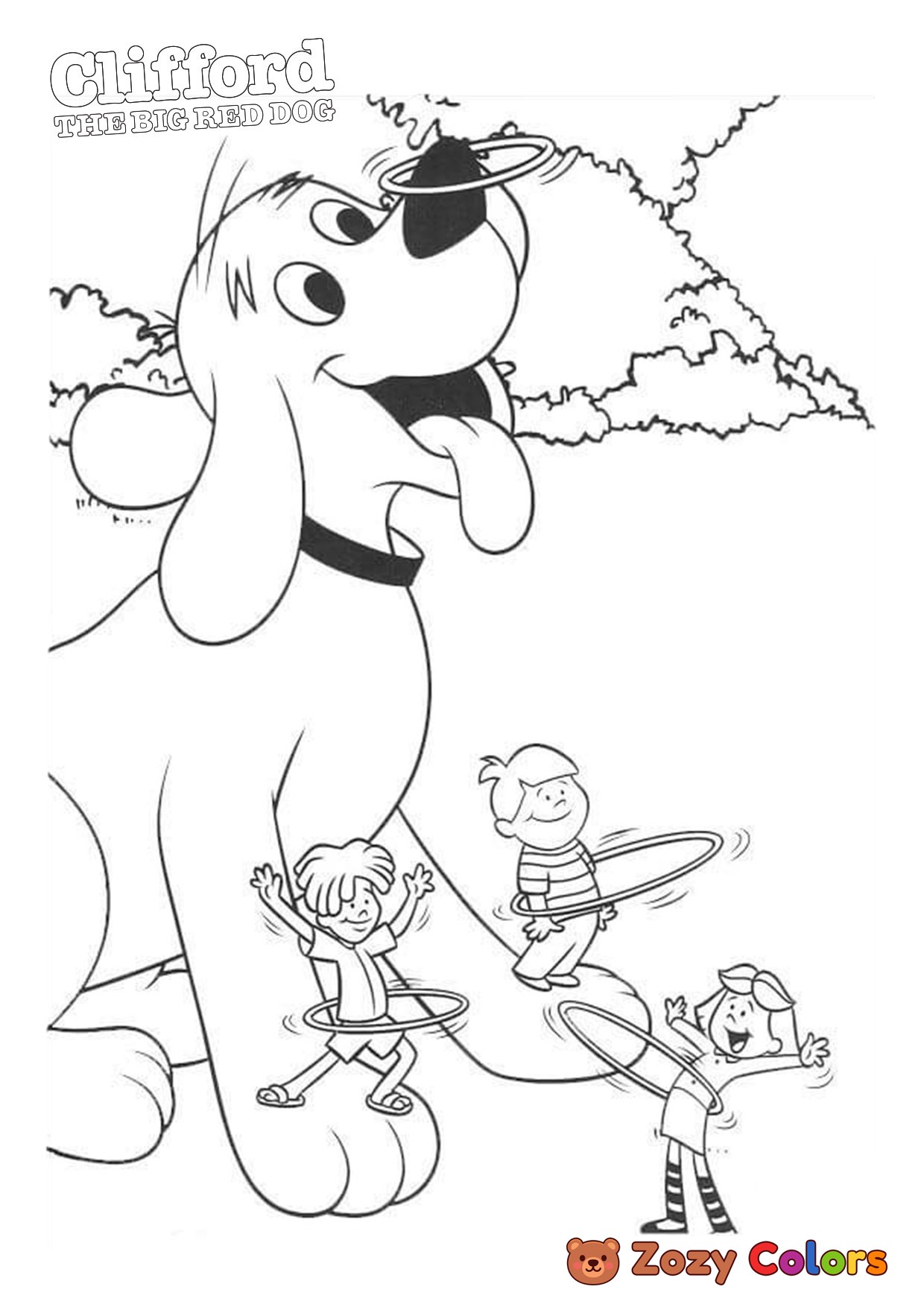 Clifford playing with friends. Coloring page to print or download and color for your kids.