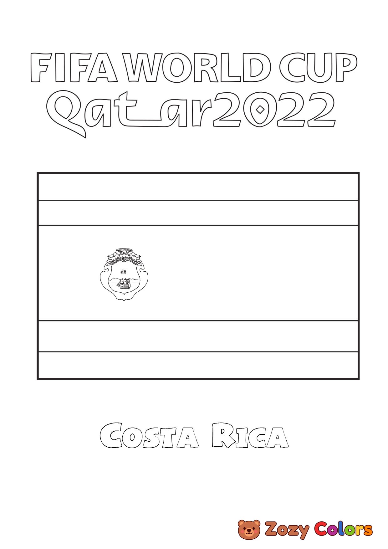 Costa Rica World Cup flag. Coloring page to print or download and color for your kids.