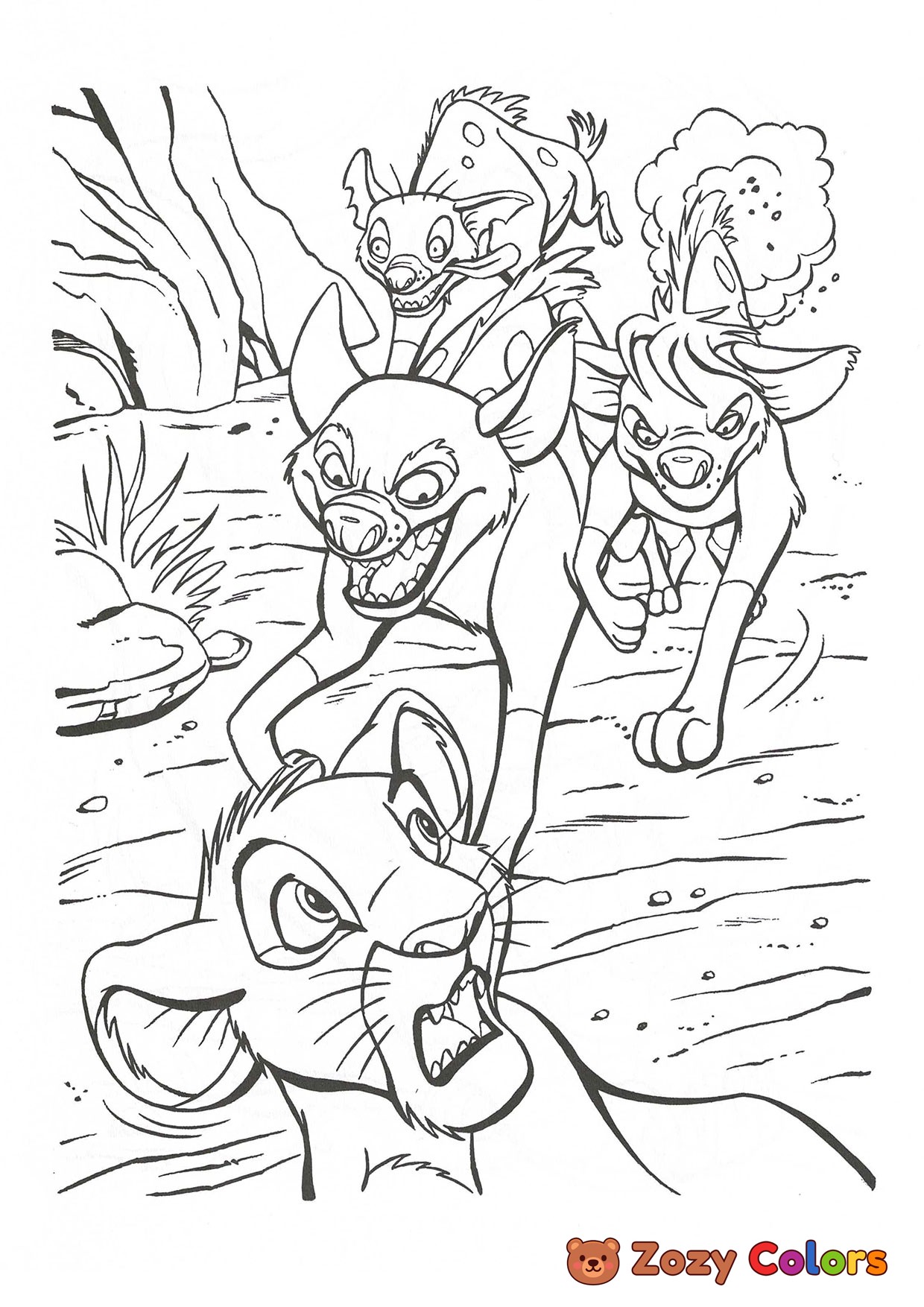 Crazy Hyenas chasing Simba from Lion King. Coloring page to print or download and color for your kids.