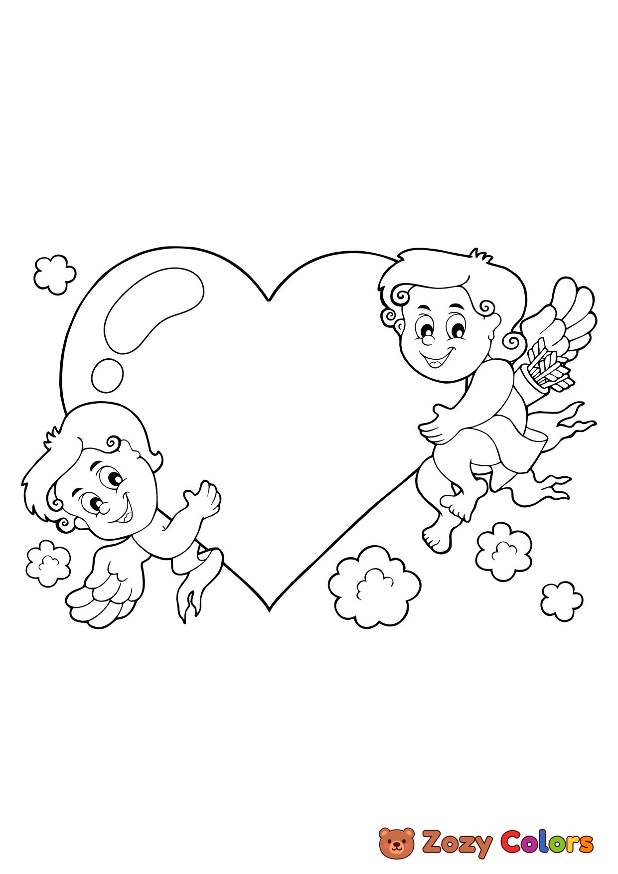 Cupis holding Valentines hearth. Coloring page to print or download and color for your kids.