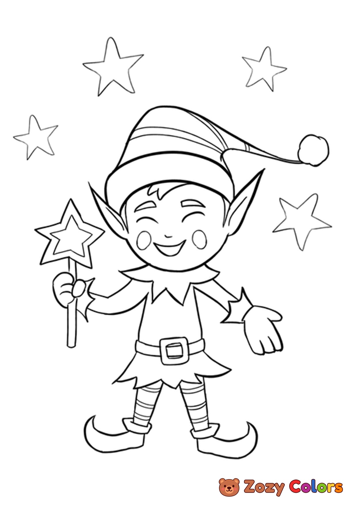 Cute Christmas elf smiling. Coloring page to print or download and color for your kids.