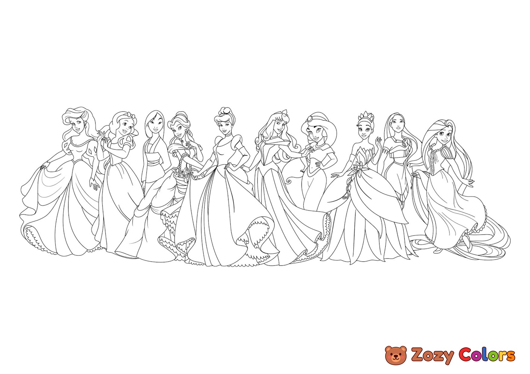 Cute Disney princesses. Coloring page to print or download and color for your kids.