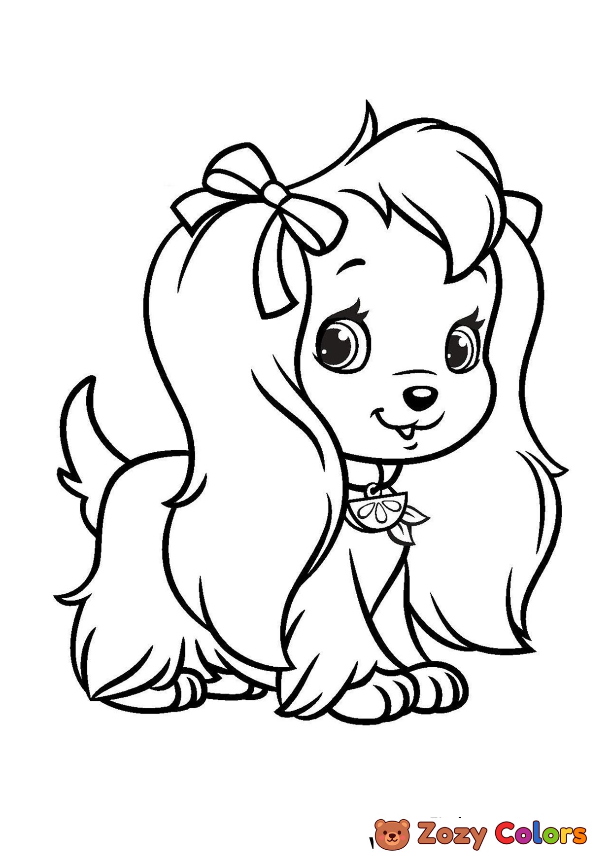 Cute dog with necklace and a bow tie on her hair. Coloring page to print or download and color for your kids.
