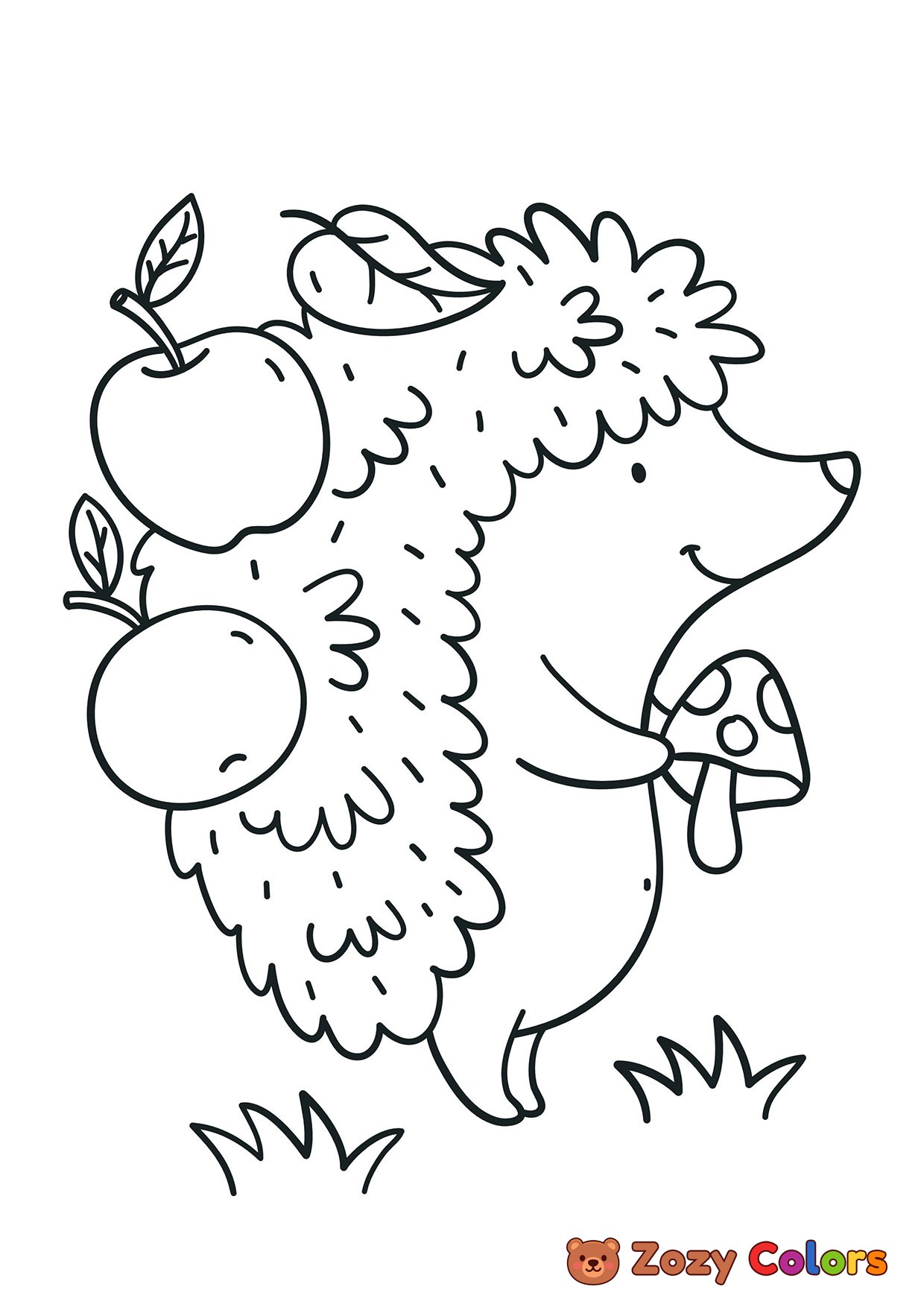 Cute hedgehog with apples. Coloring page to print or download and color for your kids.