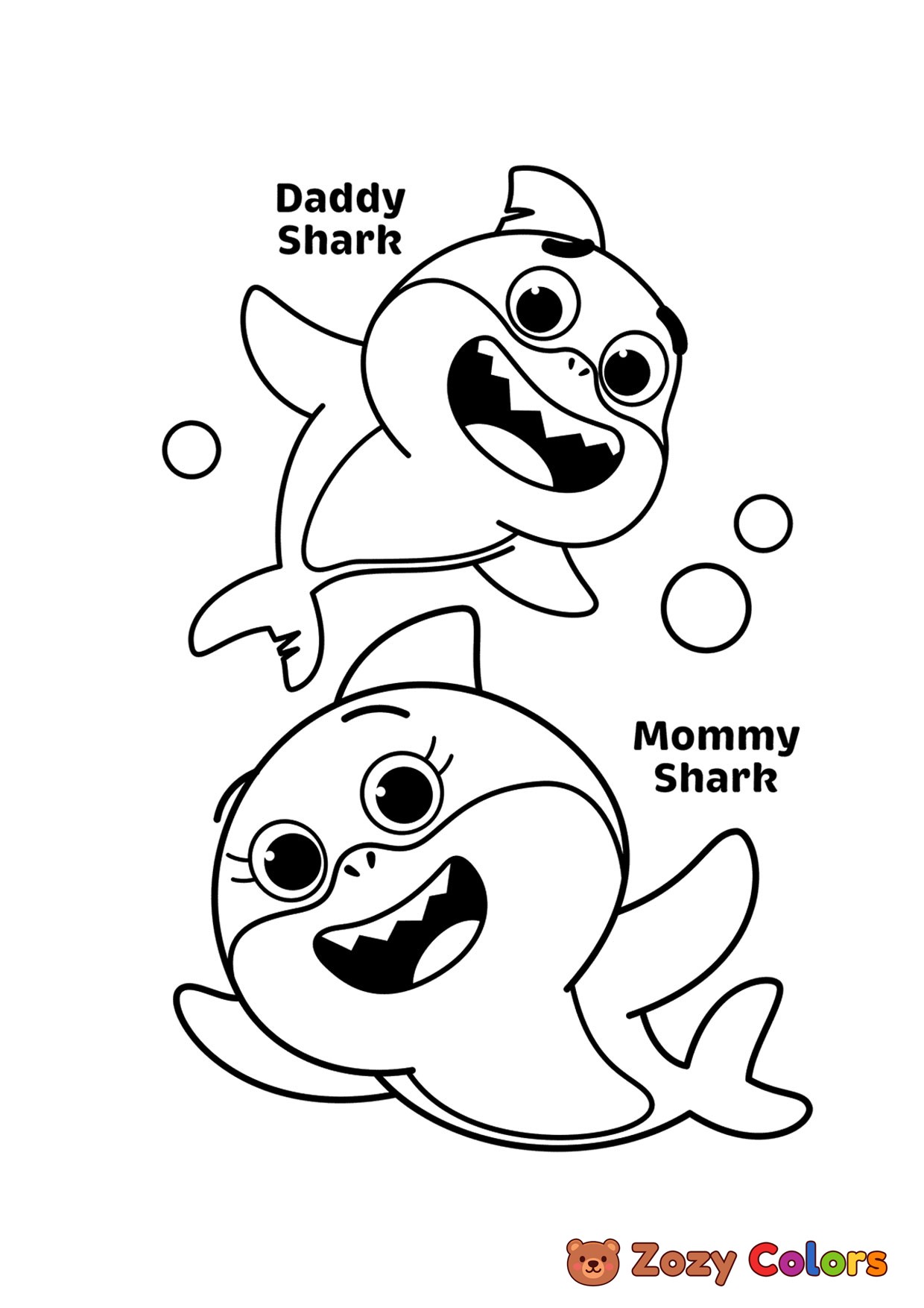 Daddy and Mommy shark. Coloring page to print or download and color for your kids.