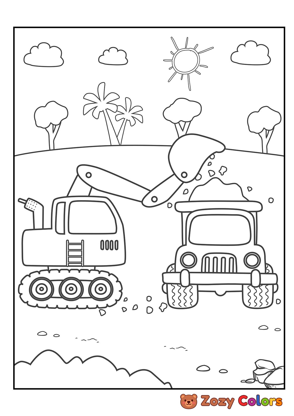 Digger loading truck. Coloring page to print or download and color for your kids.