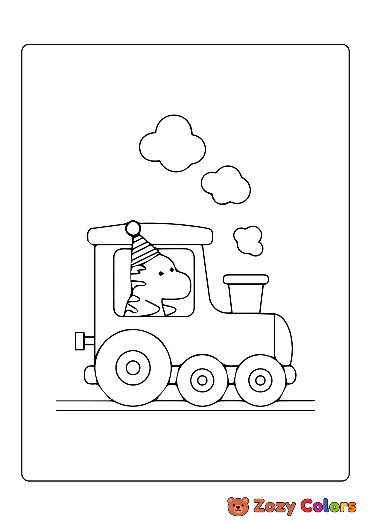 Dino driving train. Coloring page to print or download and color for your kids.