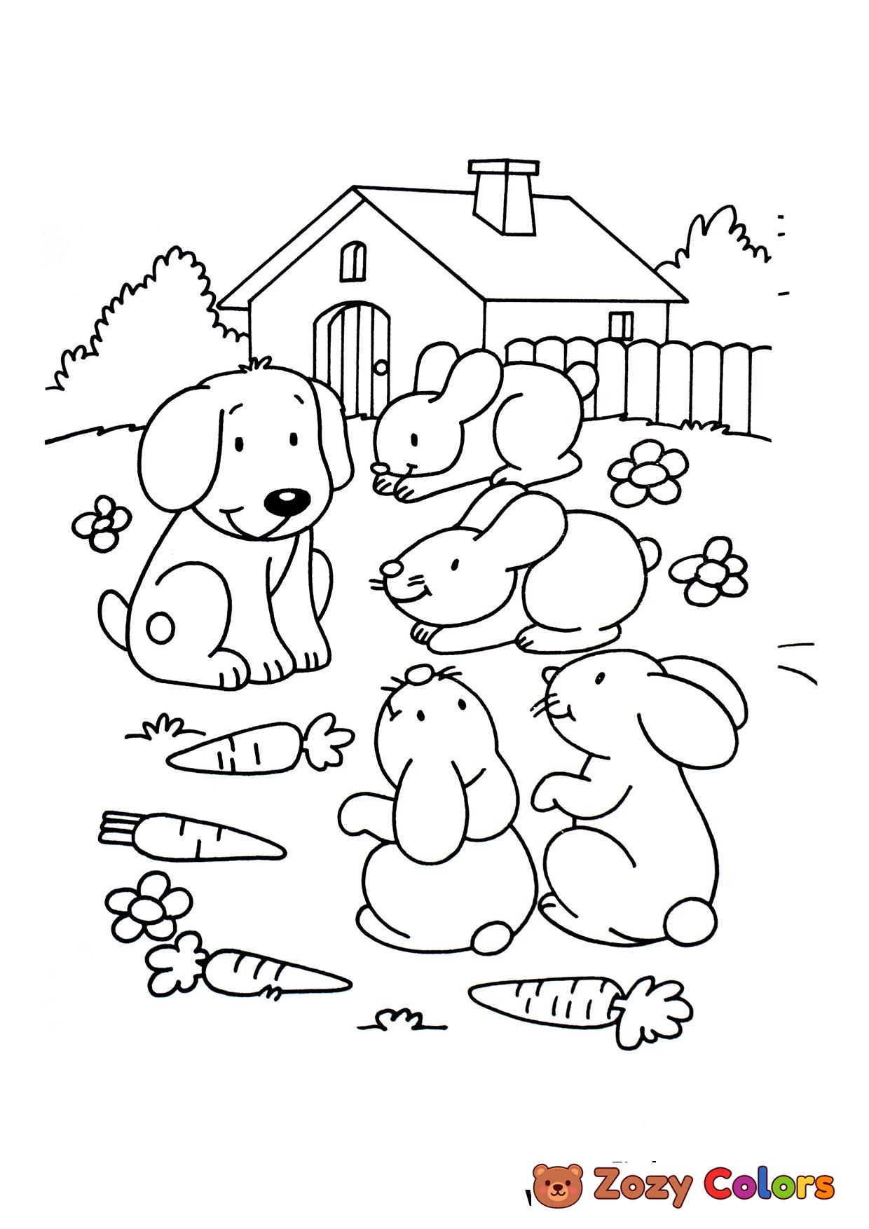 Dog hanging out with his friends rabbits in the yard. Coloring page to print or download and color for your kids.