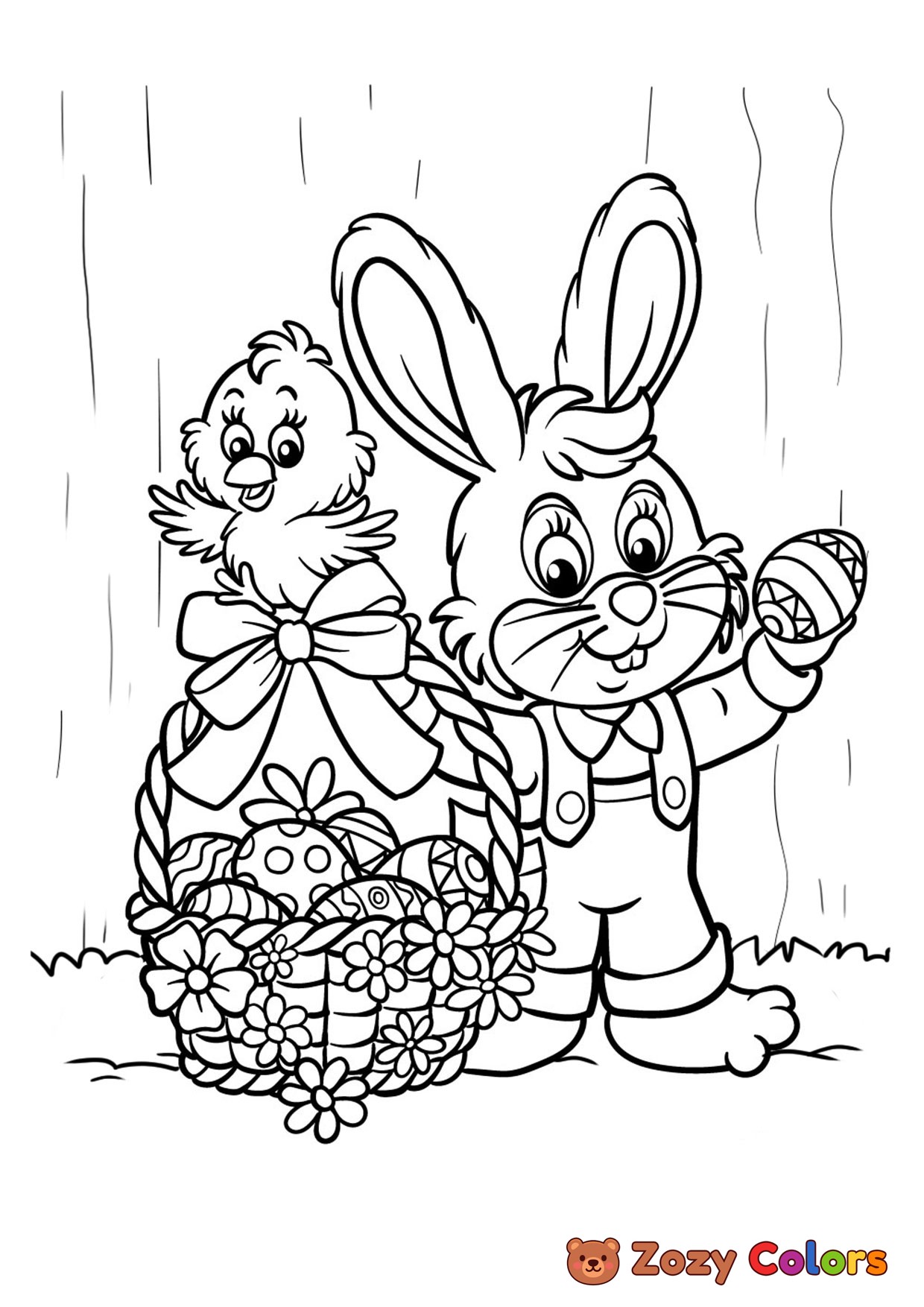 Easter bunny and a chick. Coloring page to print or download and color for your kids.