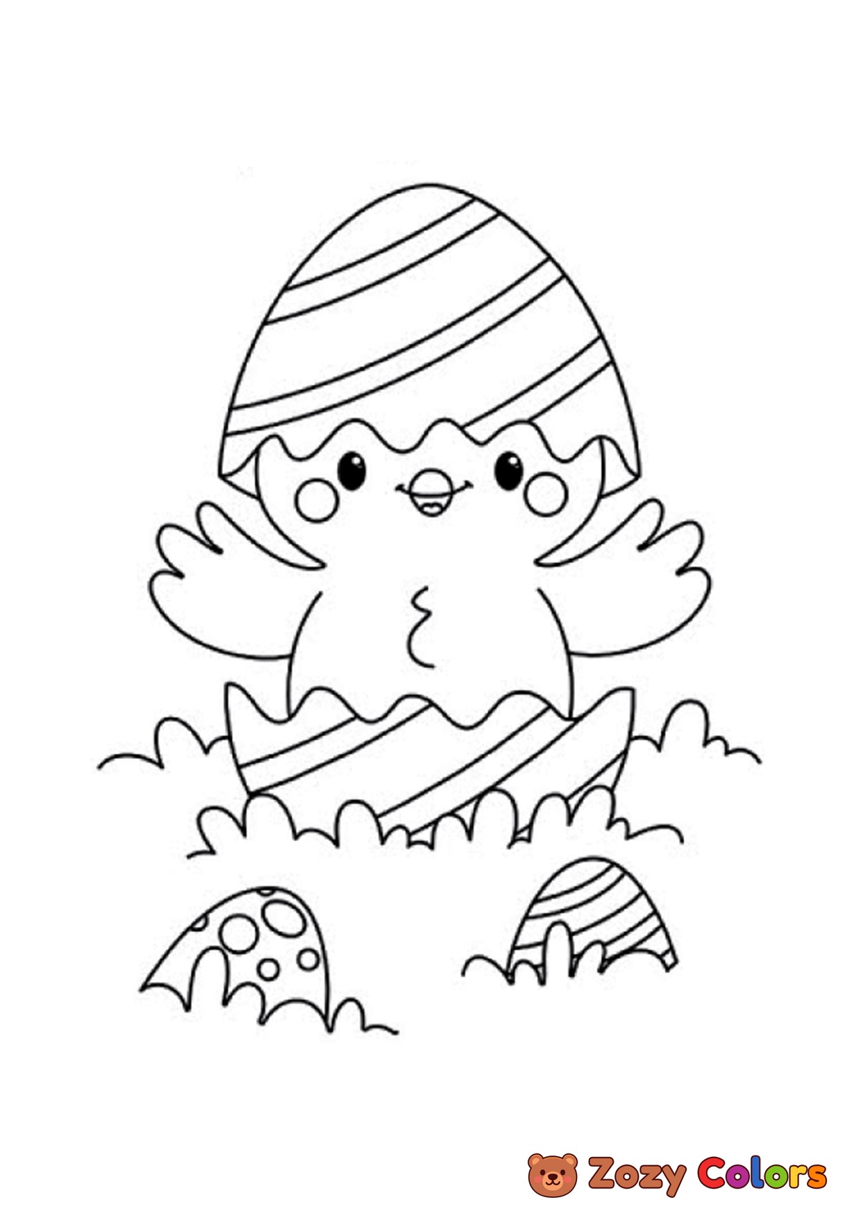 Easter chick in an egg. Coloring page to print or download and color for your kids.