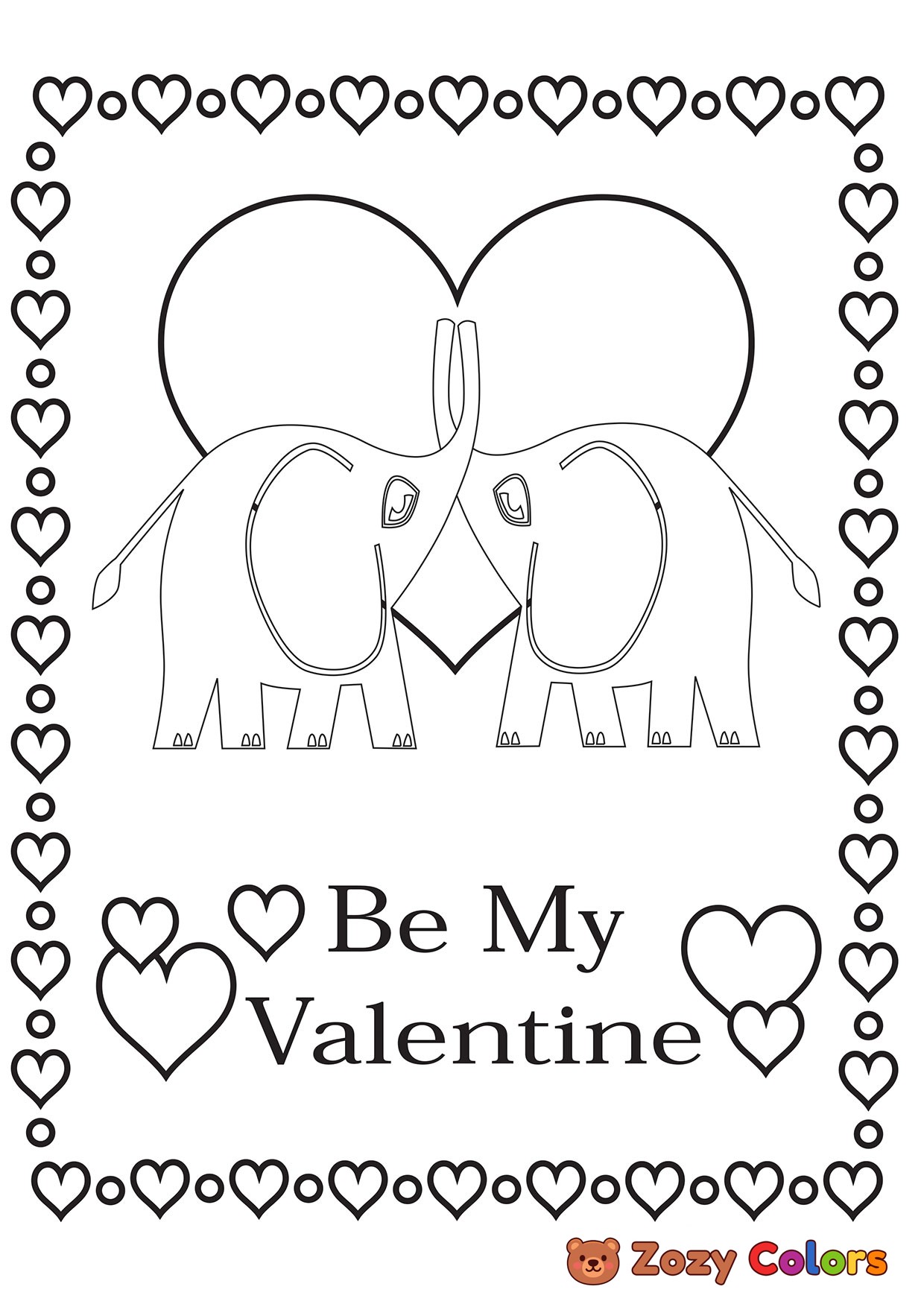 Elephant Valentines card. Coloring page to print or download and color for your kids.
