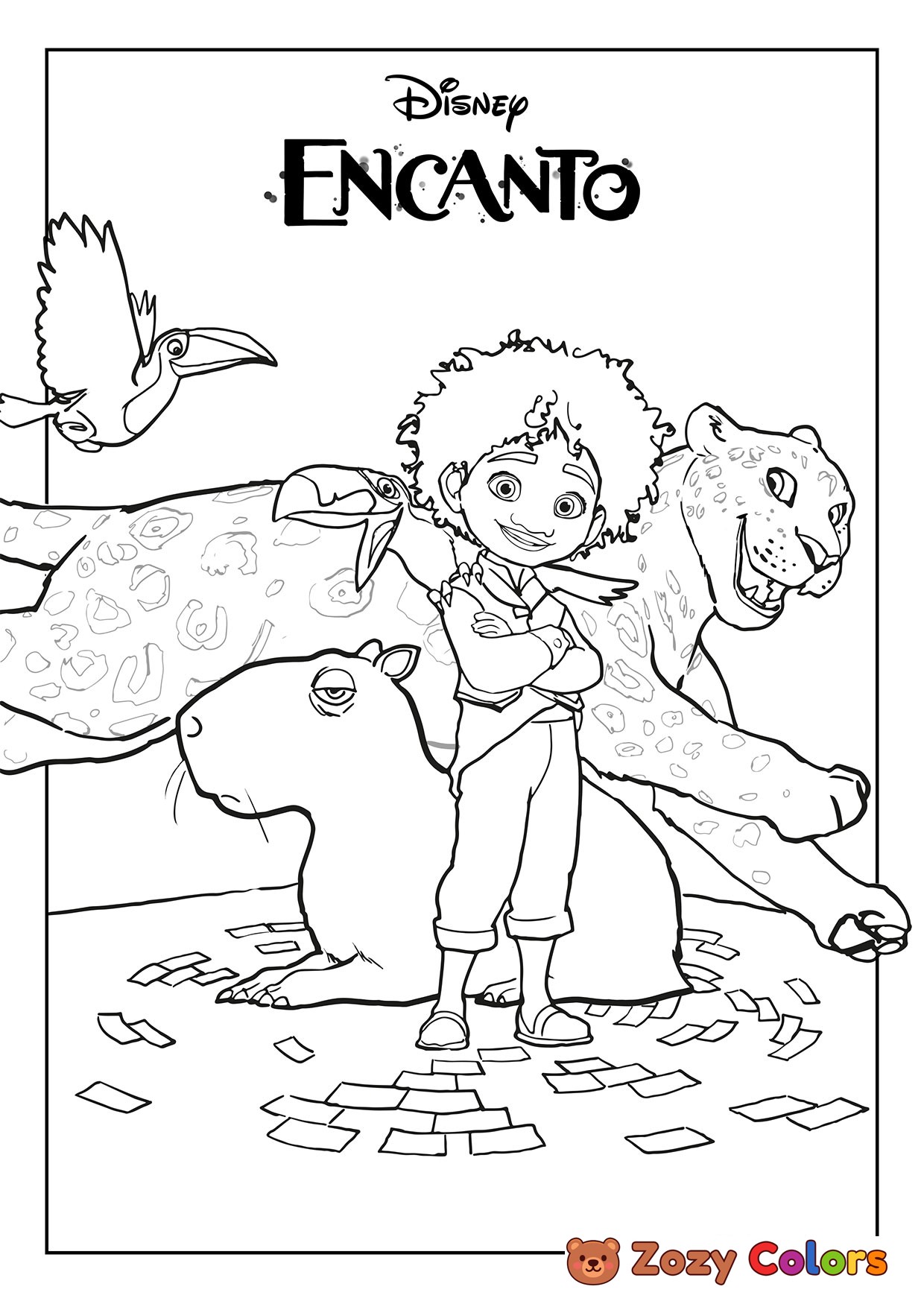 Encanto Antonio with his animals. Coloring page to print or download and color for your kids.