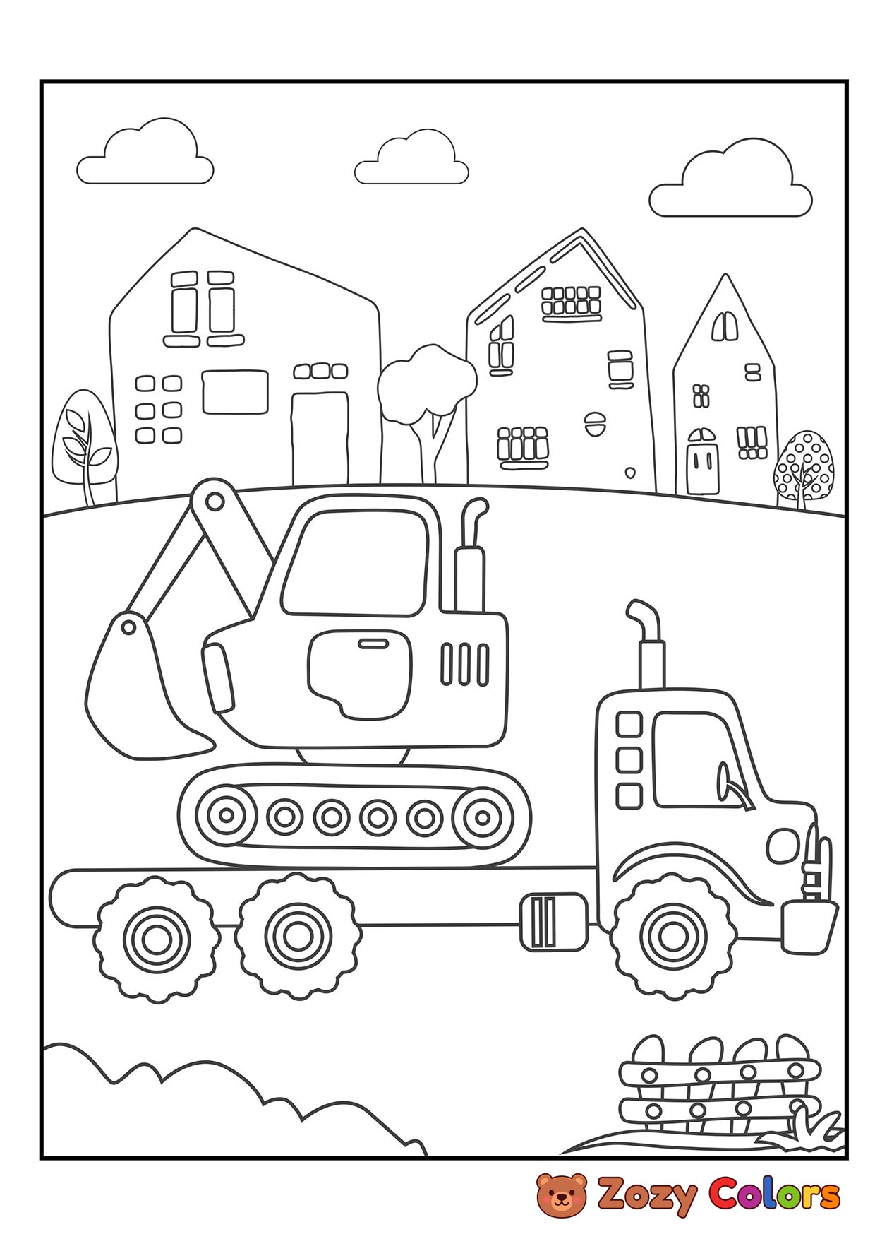 Excavator on a truck. Coloring page to print or download and color for your kids.