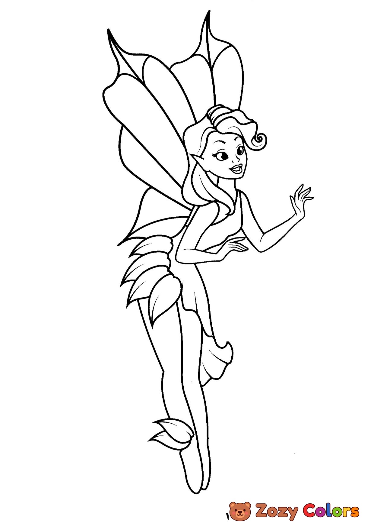 Fairy with leaves flying around. Coloring page to print or download and color for your kids.