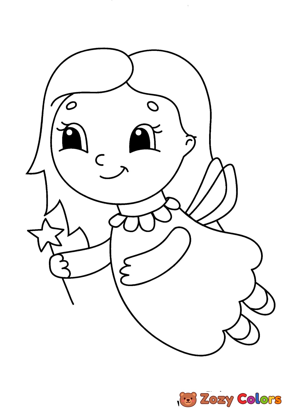 Fairy with start magic wand flying. Coloring page to print or download and color for your kids.