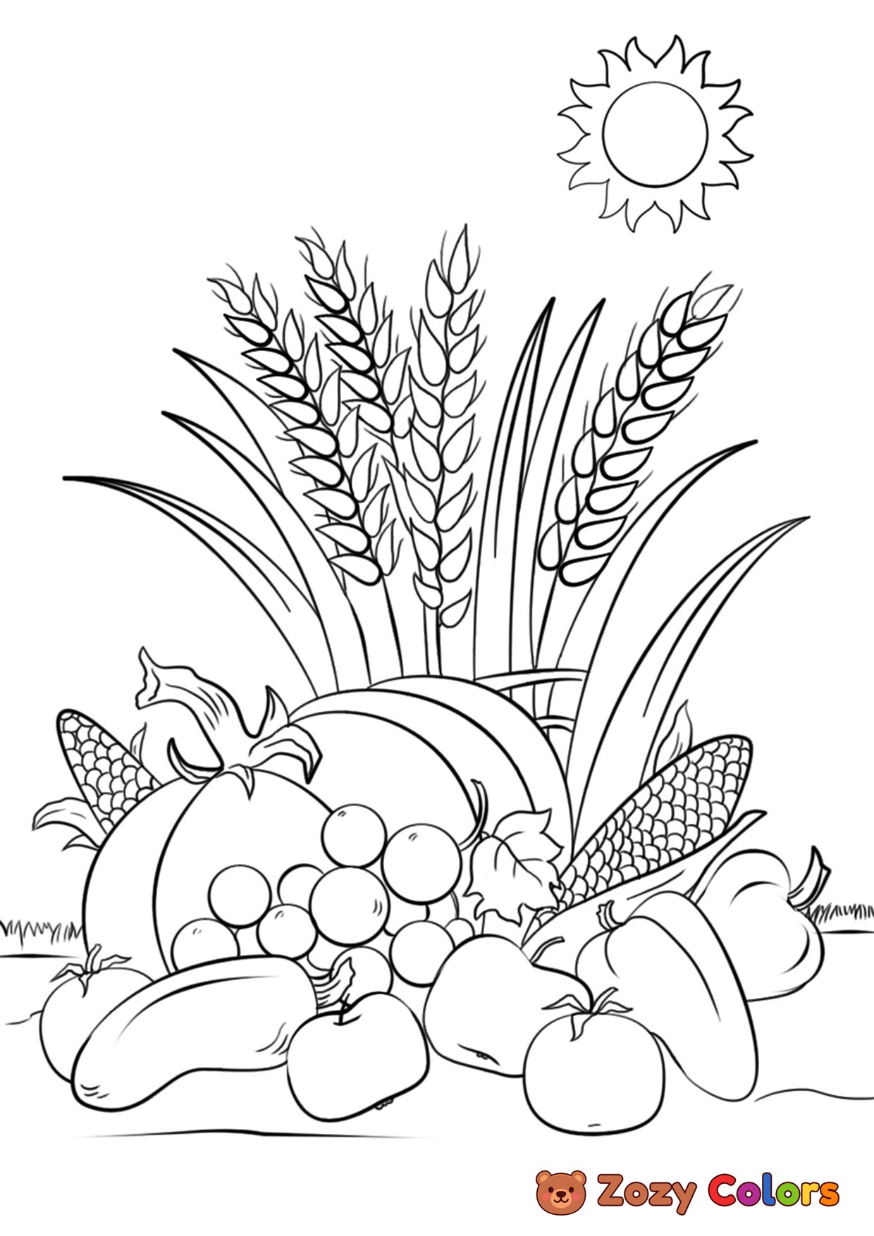 Fall fruit harvest. Coloring page to print or download and color for your kids.