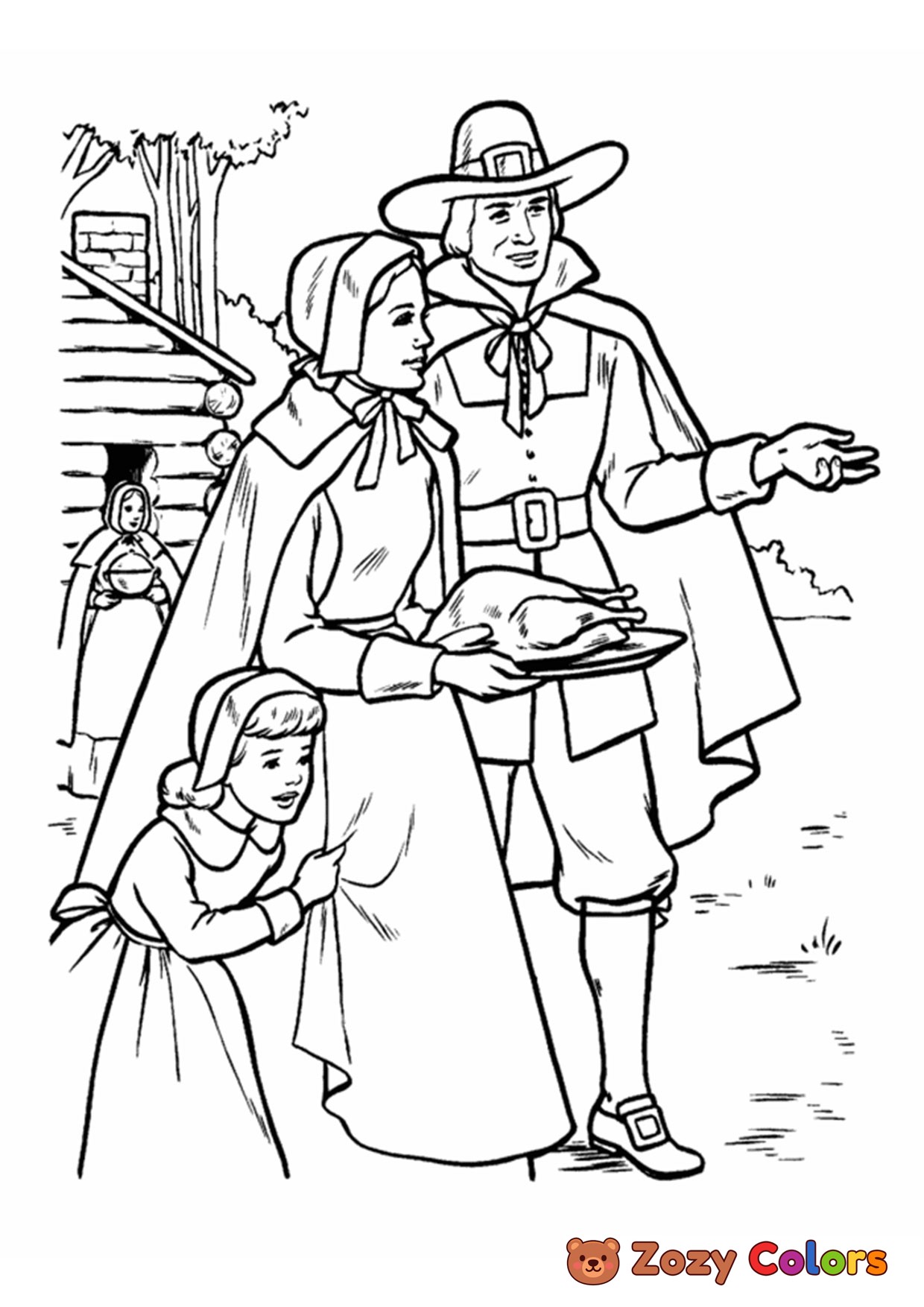 Family on Thanksgiving. Coloring page to print or download and color for your kids.