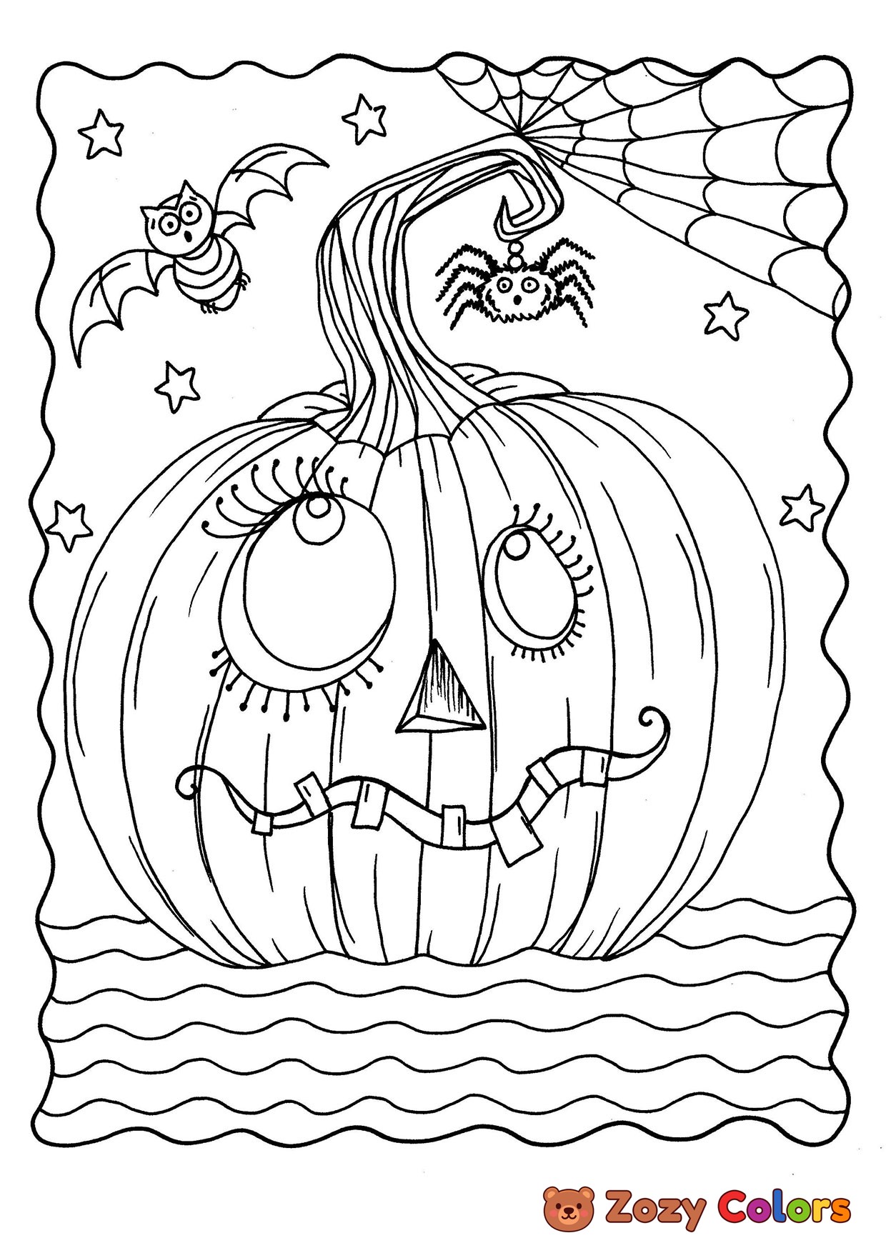 Female halloween pumpkin. Coloring page to print or download and color for your kids.