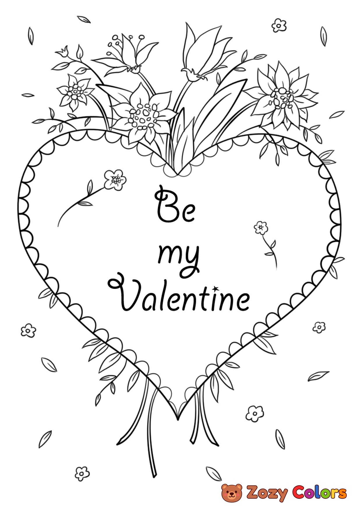 Flower Valentines card. Coloring page to print or download and color for your kids.