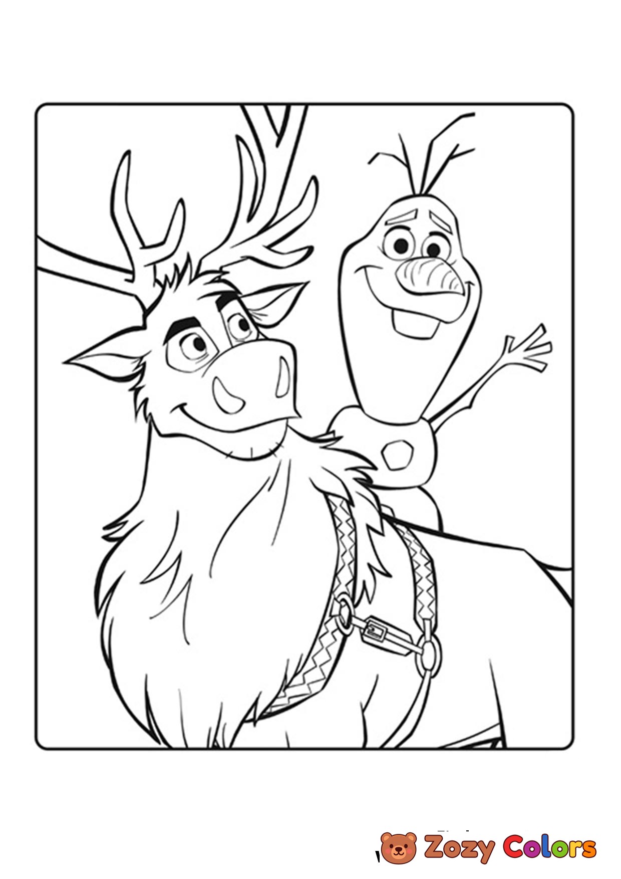 Frozen Olaf riding on his favorite friend Sven. Coloring page to print or download and color for kids.