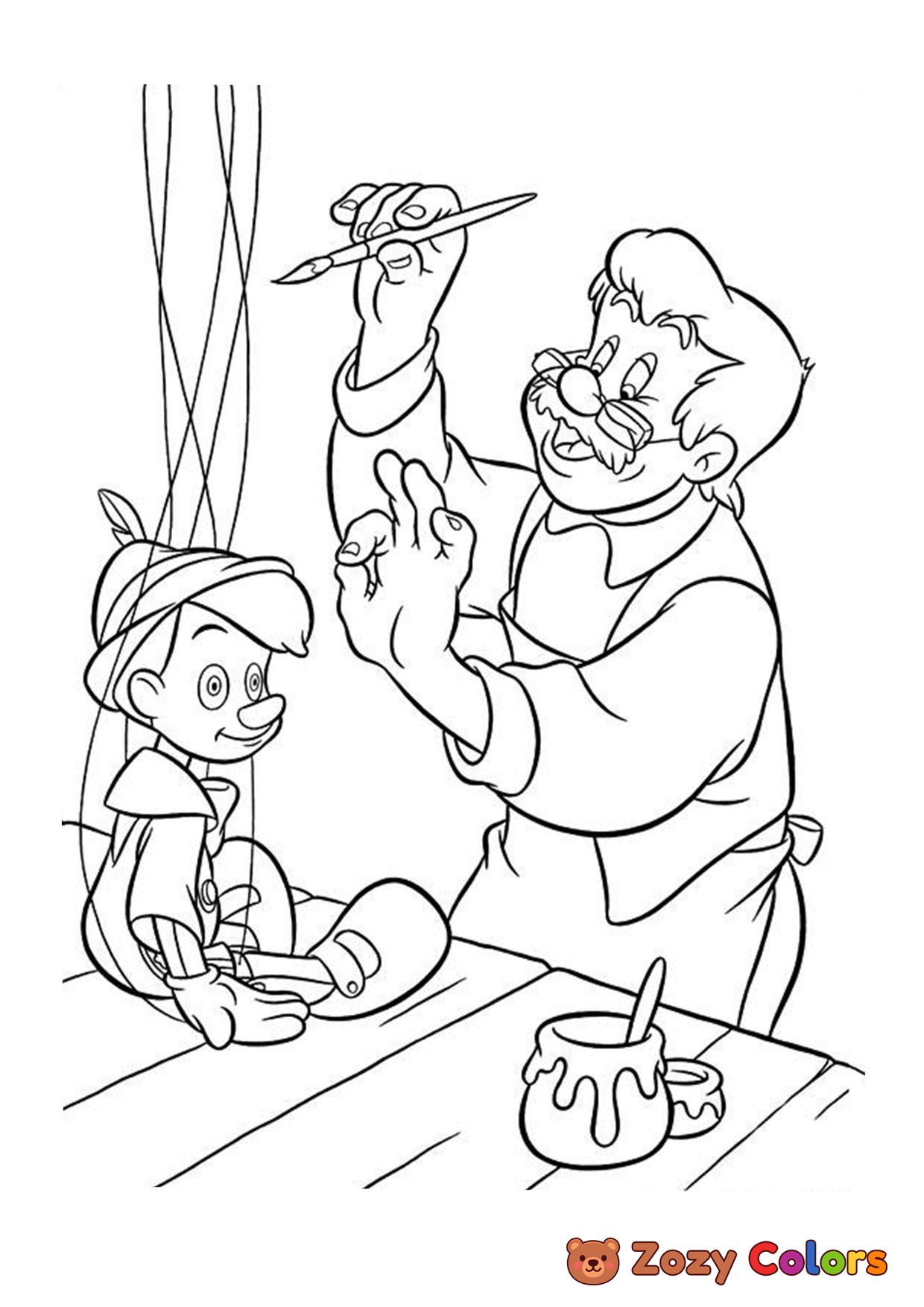 Gepeto making Pinocchio. Coloring page to print or download and color for your kids.