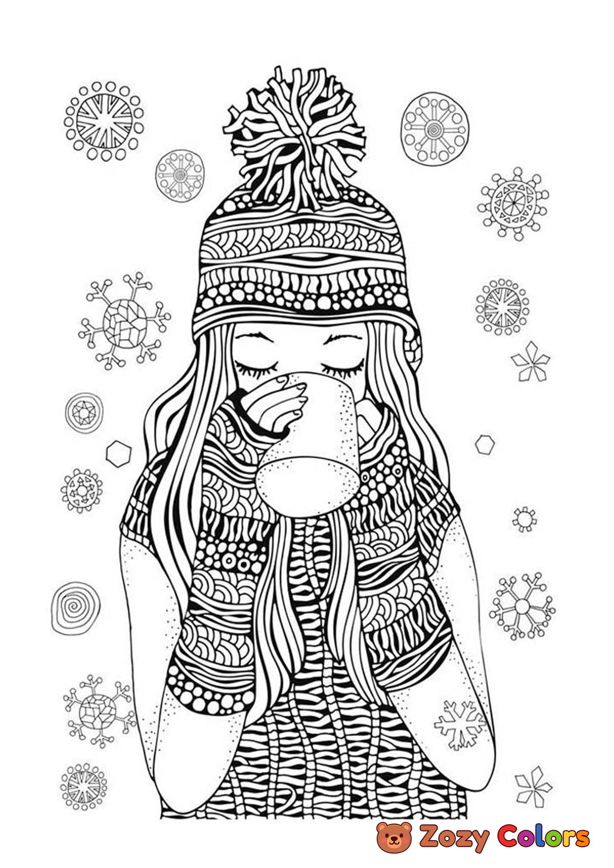Girl drinking tea. Coloring page to print or download and color for your kids.