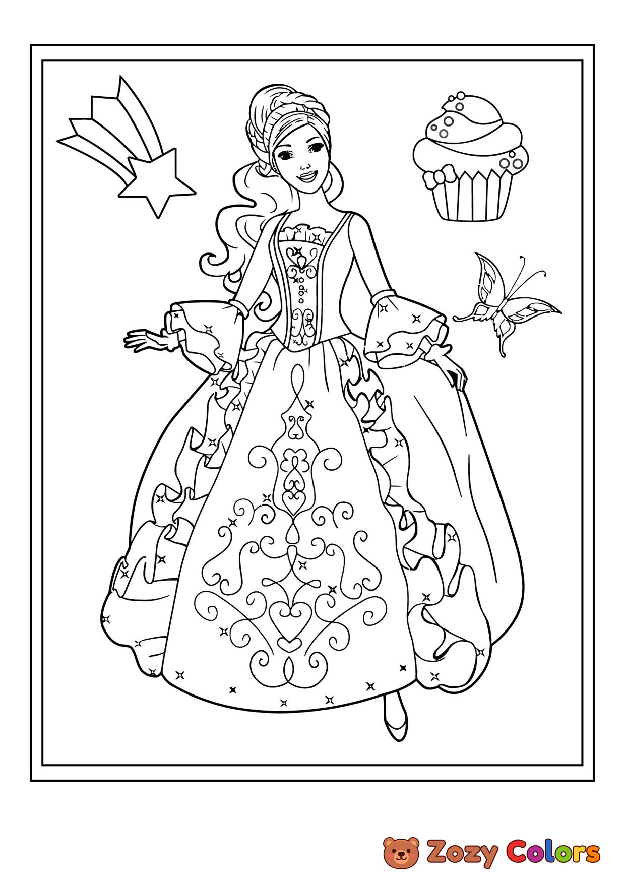 Girl in dress. Coloring page to print or download and color for your kids.
