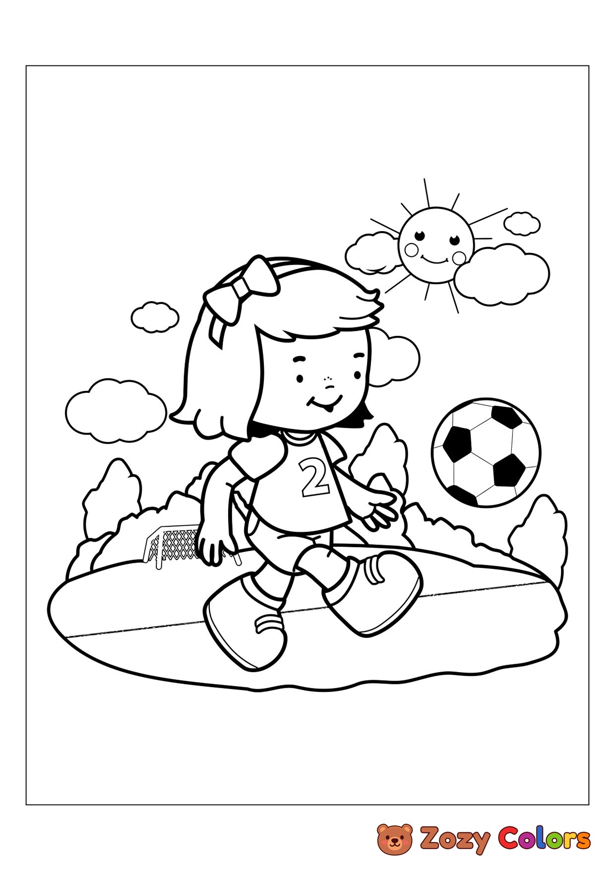 Girl kicking soccer ball. Coloring page to print or download and color for your kids.