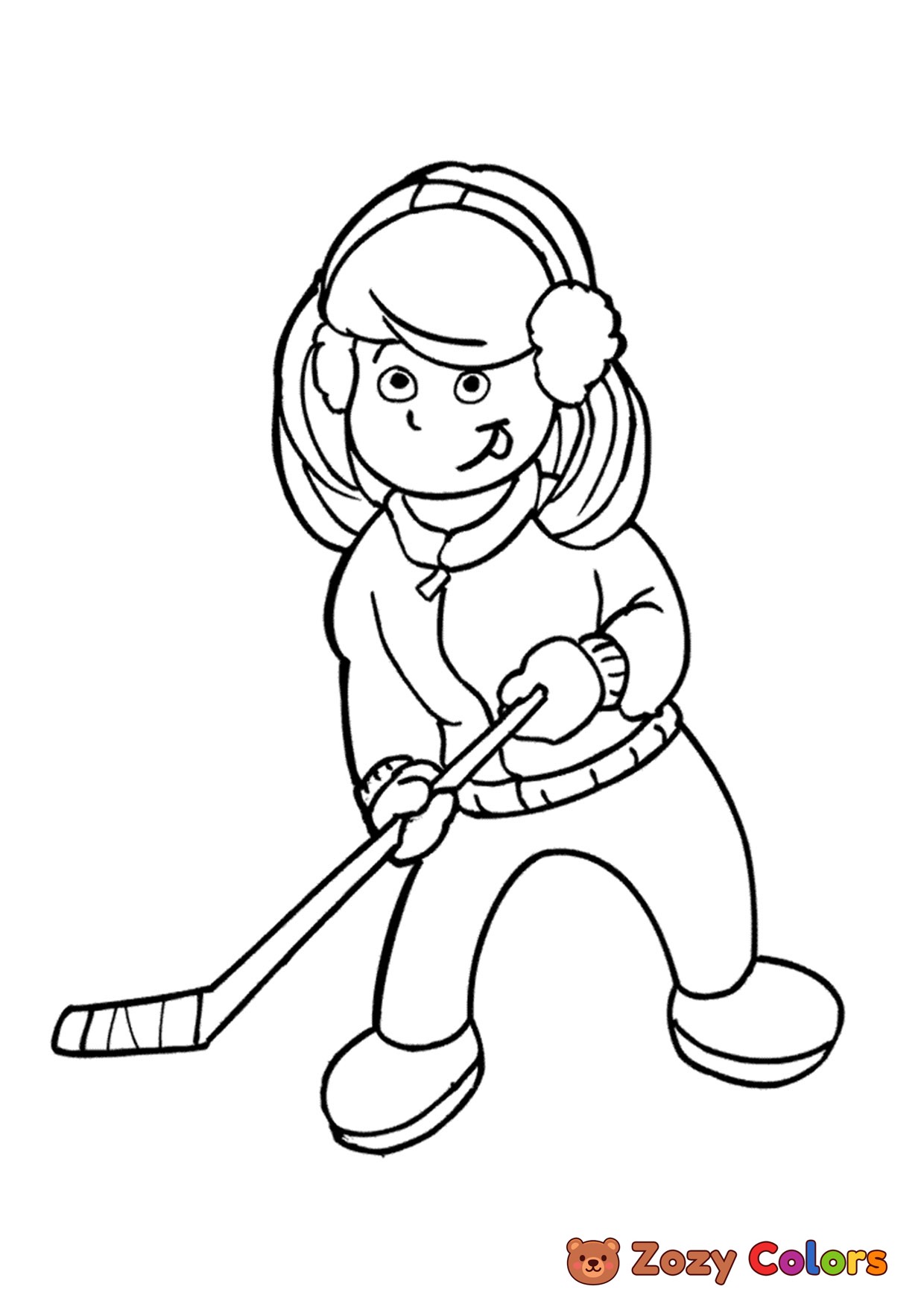 Girl playing ice hockey. Coloring page to print or download and color for your kids.