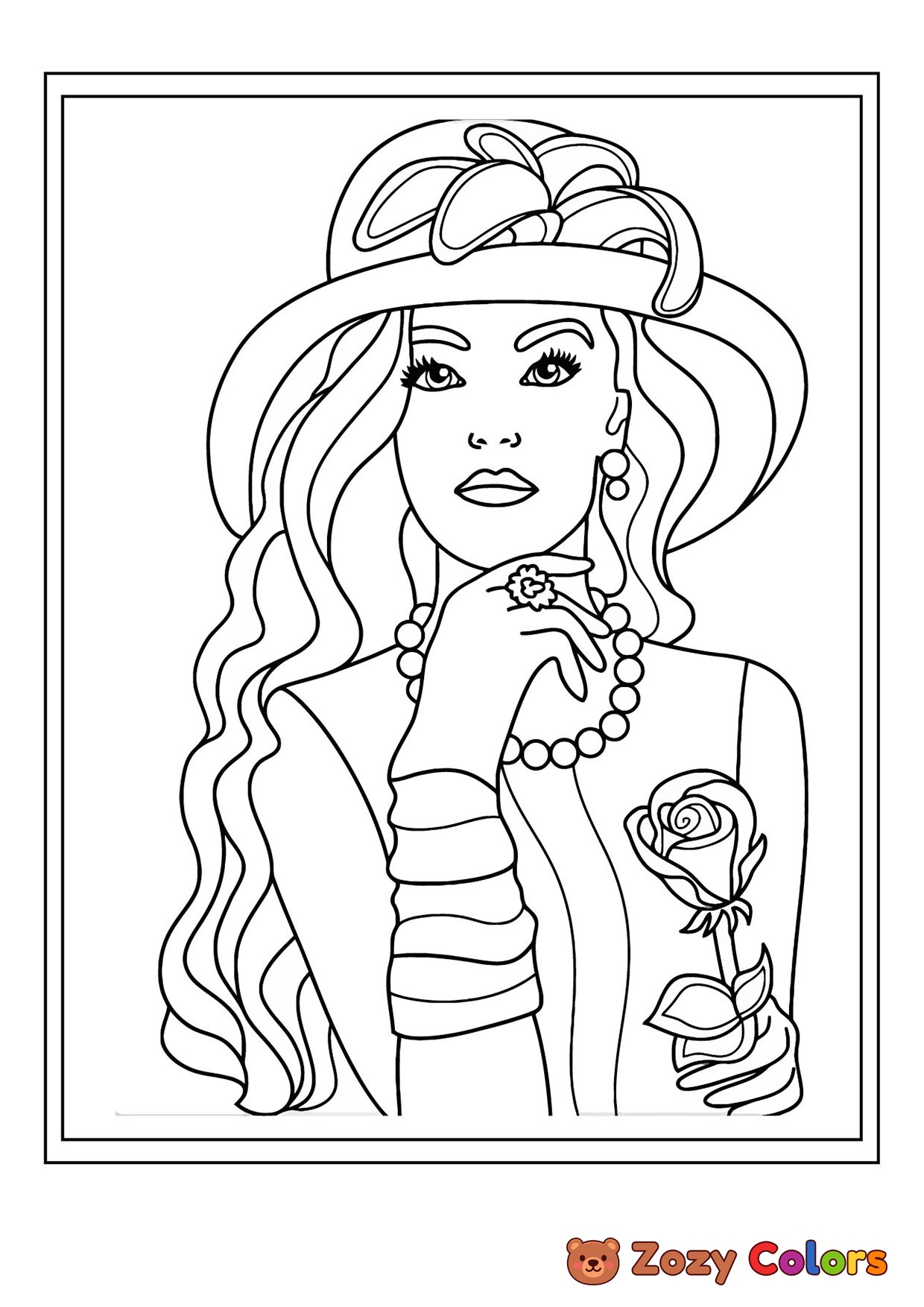 Girl posing with flower. Coloring page to print or download and color for your kids.