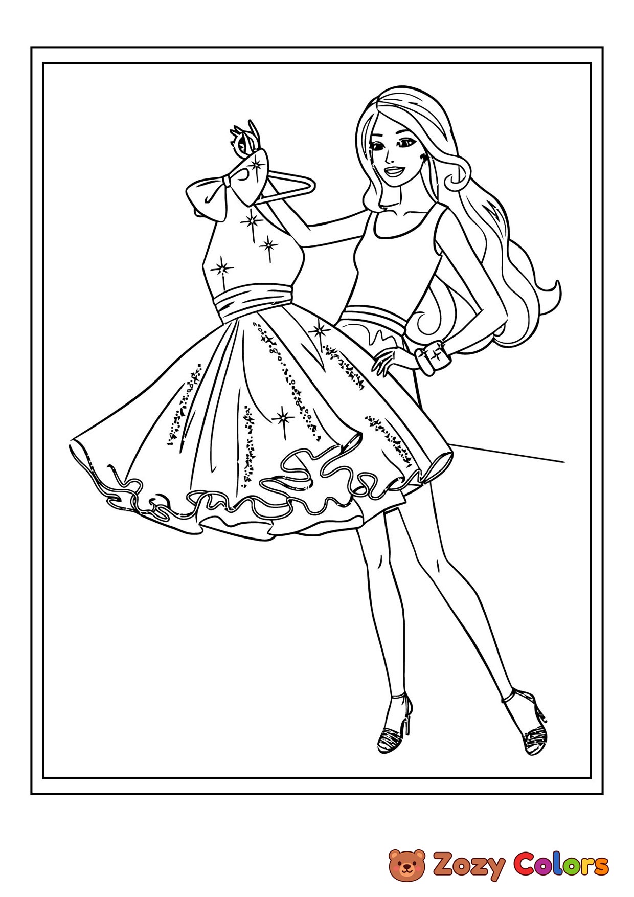 Girl trying dress. Coloring page to print or download and color for your kids.