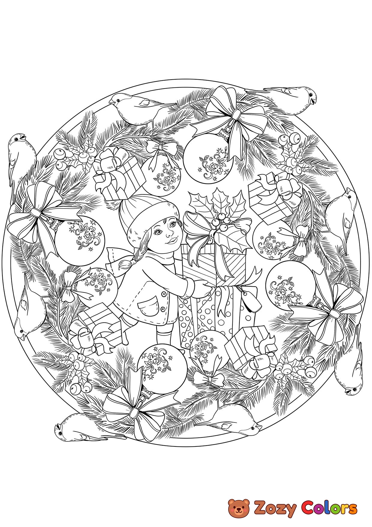 Girl with presents in christmas mandala. Coloring page to print or download and color for your kids.