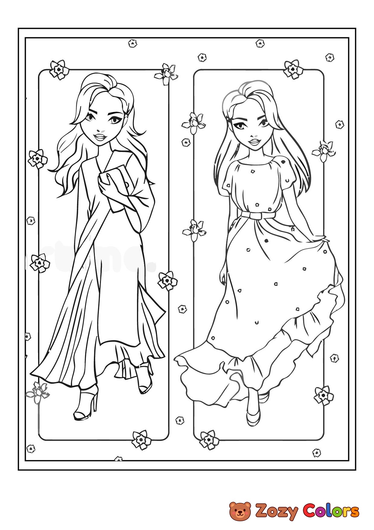 Girls in dresses. Coloring page to print or download and color for your kids.