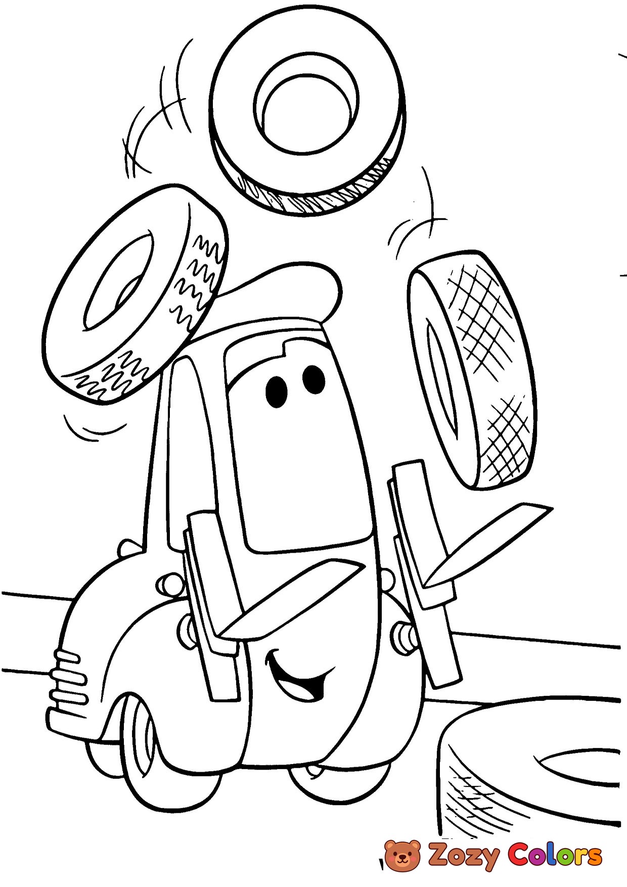 Guido balancing tires. Coloring page to print or download and color for your kids.