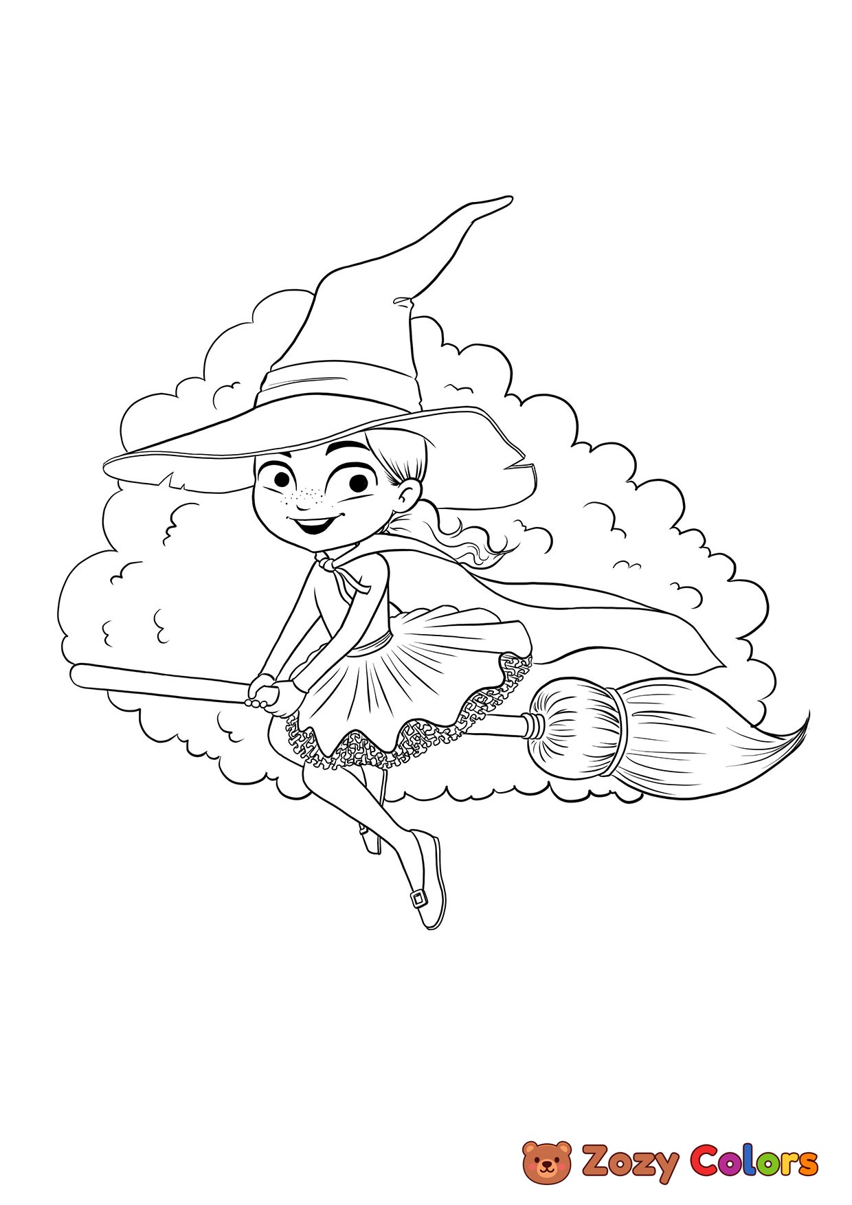 Halloween witch flying on a broom. Coloring page to print or download and color for your kids.