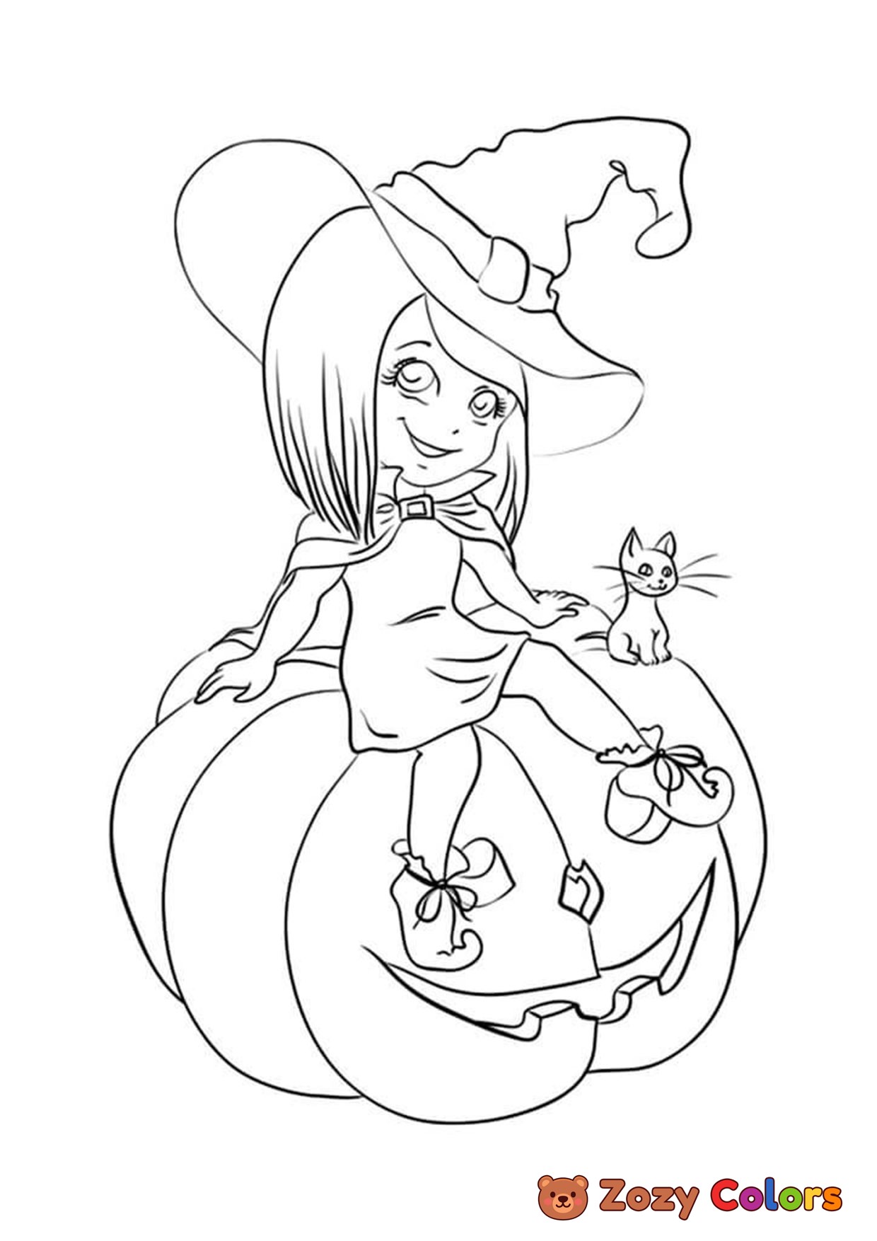<p>Halloween witch on a pumpkin. Coloring page to print or download and color for your kids.</p>