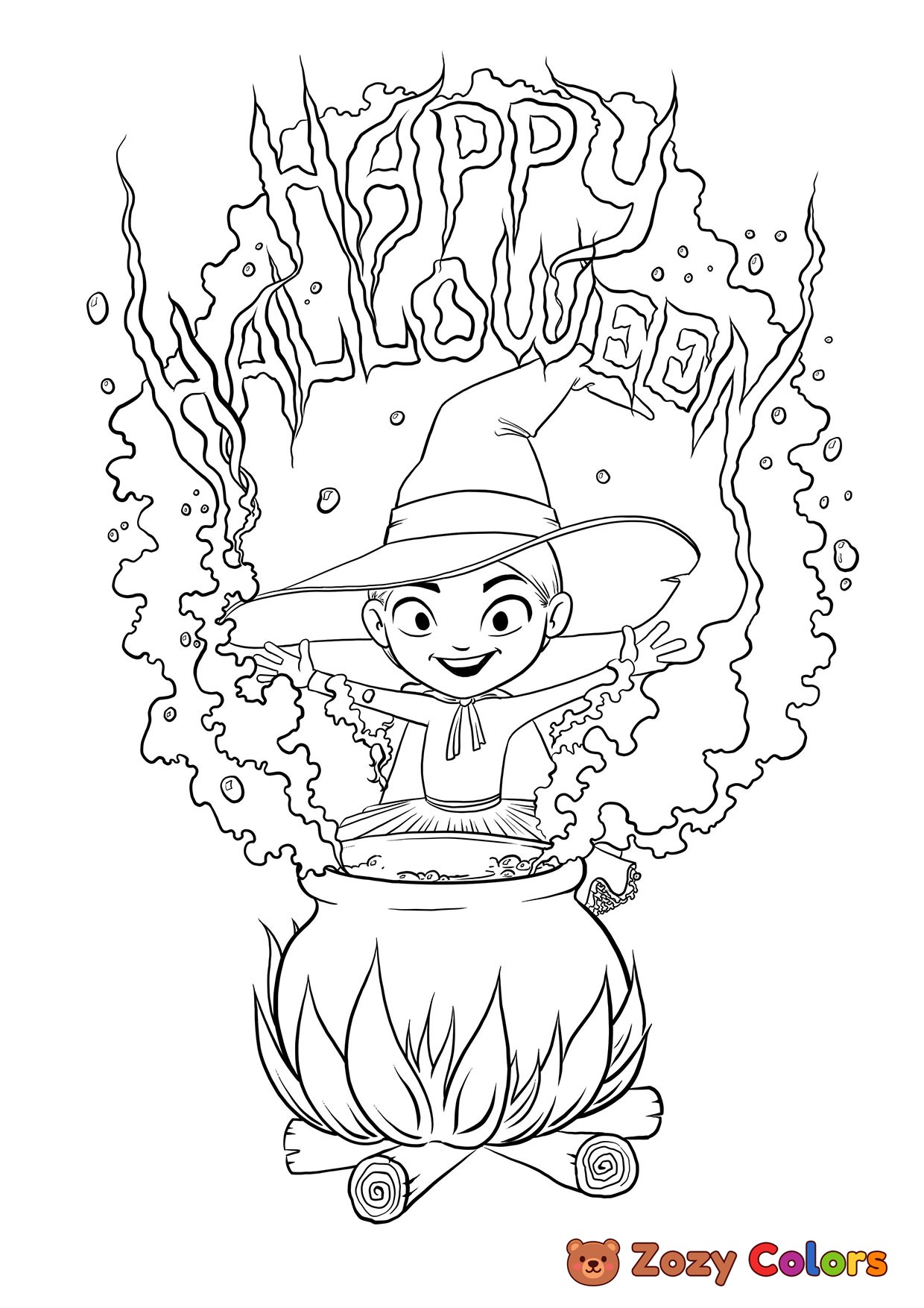 Halloween witch with a cauldron. Coloring page to print or download and color for your kids.