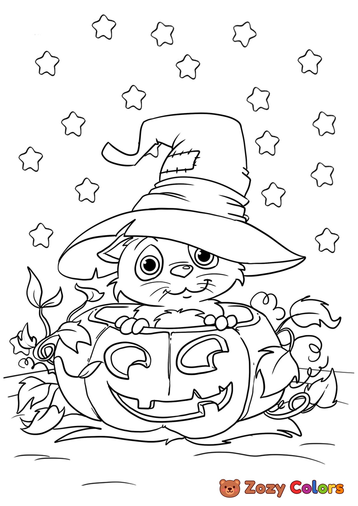 Hallween cat in a pumpkin. Coloring page to print or download and color for your kids.
