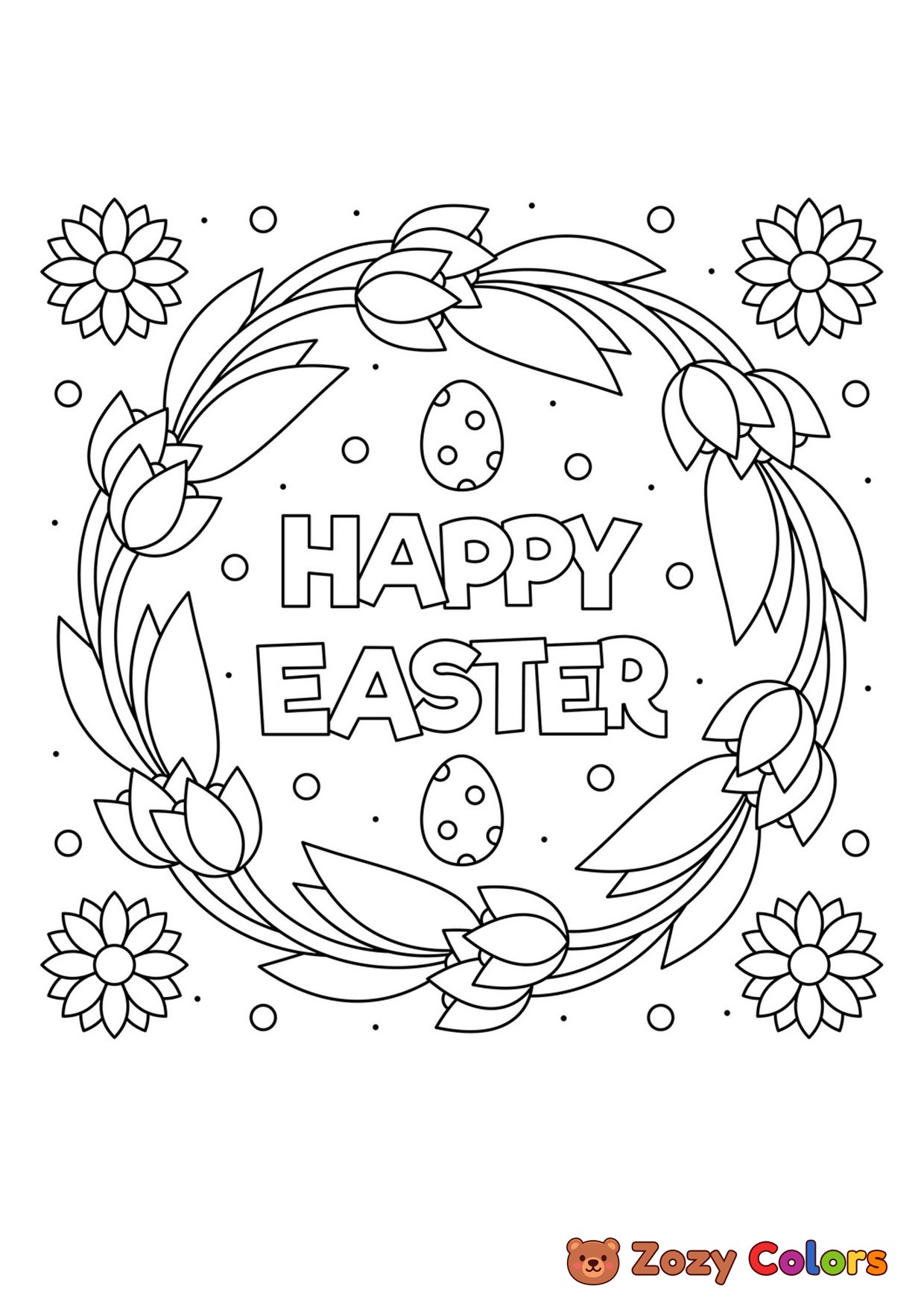 Happy Easter wreath. Coloring page to print or download and color for your kids.