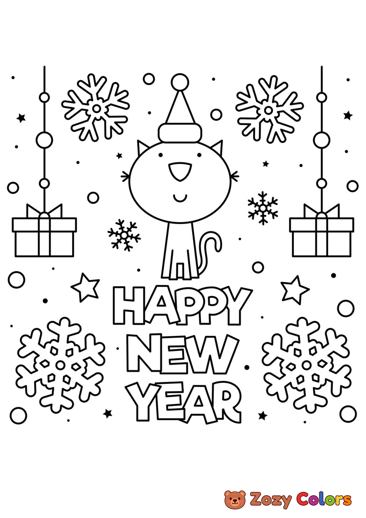 Happy New Year from a Cat. Coloring page to print or download and color for your kids.