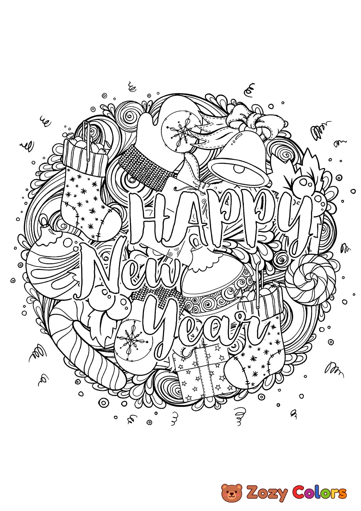 Happy New Year mandala. Coloring page to print or download and color for your kids.