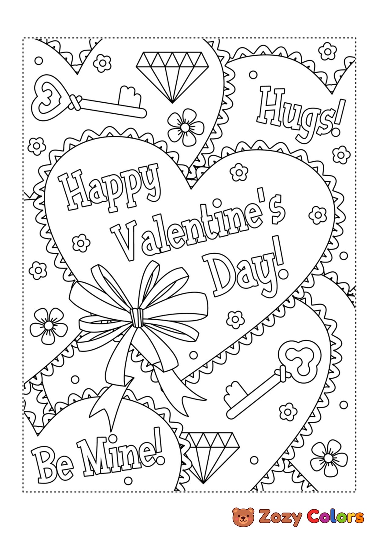 Happy Valentines day card. Coloring page to print or download and color for your kids.