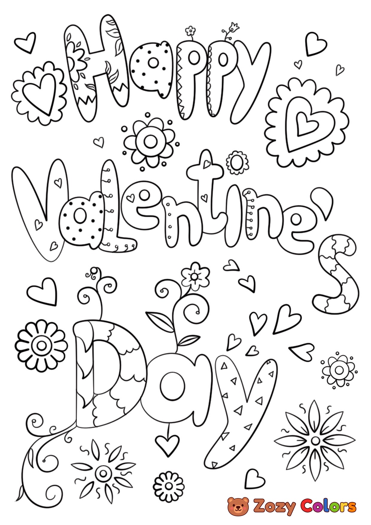 Happy Valentines day doodle. Coloring page to print or download and color for your kids.