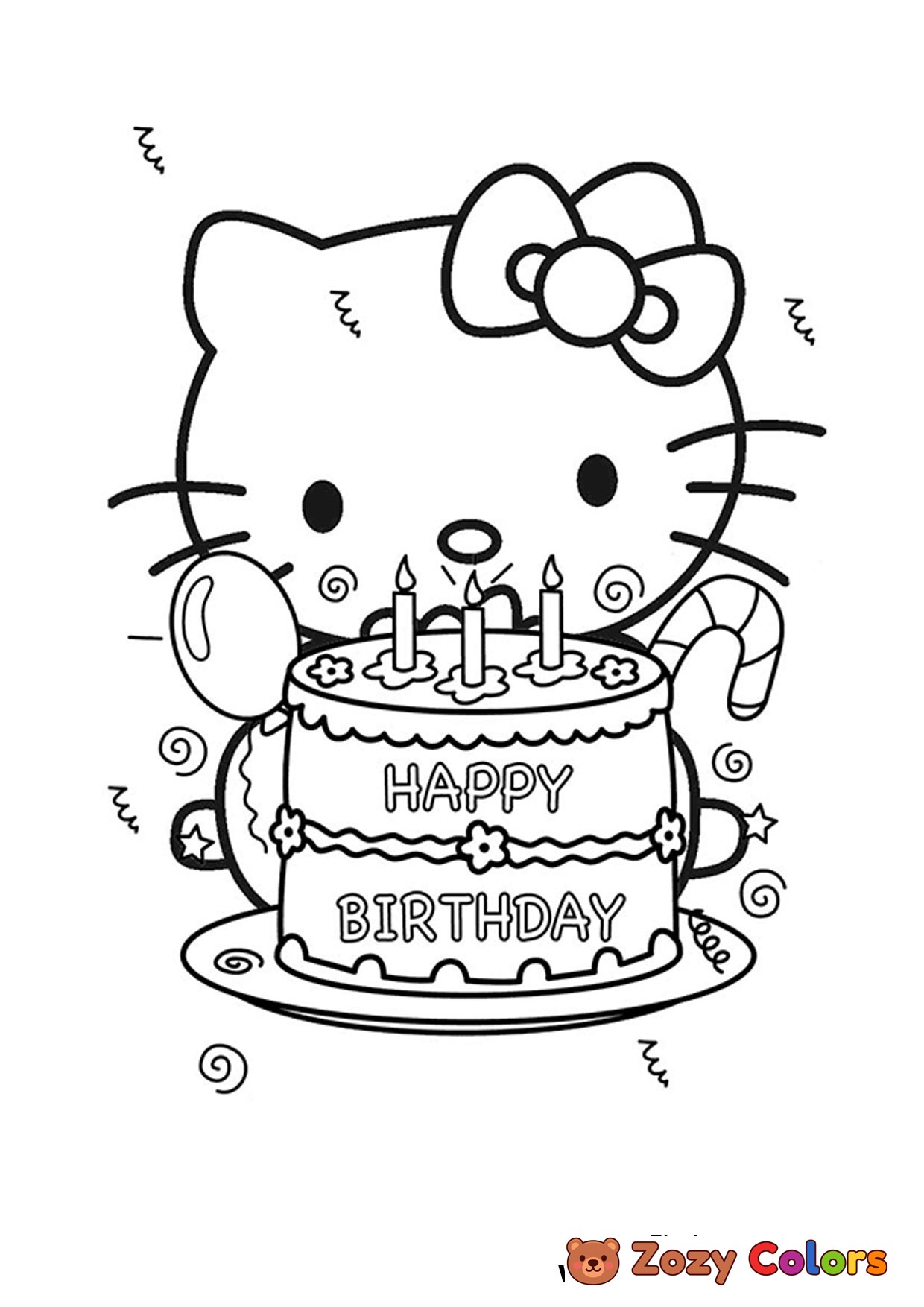 Hello Kitty birthday with a cake to celebrate. Coloring page to print or download and color.